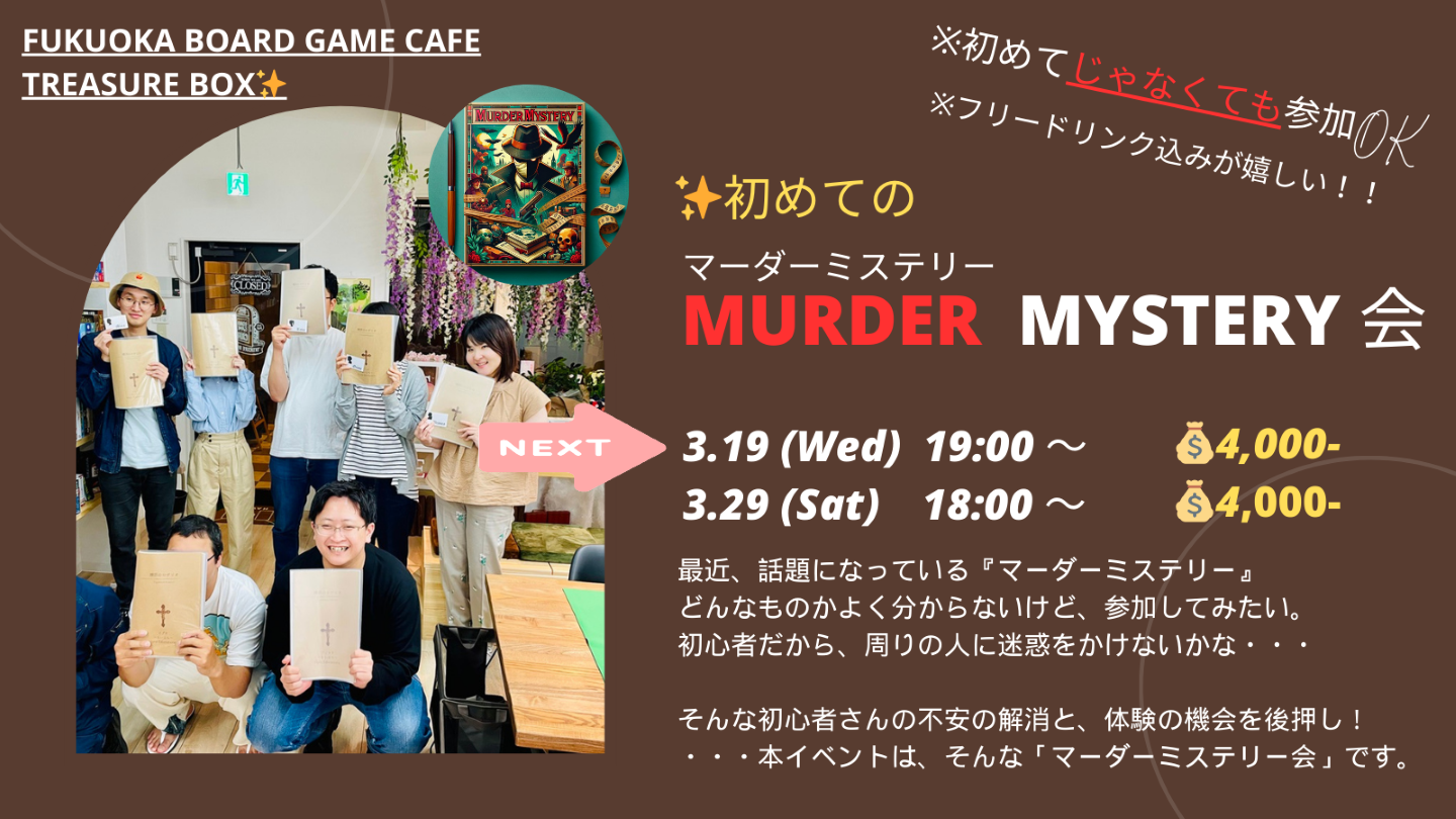 | 詳細内容 | 初めてのマーダーミステリー会🕵️🔰 ・マーダーミステリーに興味を持ち始めた方 ・マーダーミステリーに初めて参加される方 ・何度か体験済だけど、常連さんの中に入って本格的なシナリオをプレイするのは、まだ少し不安…