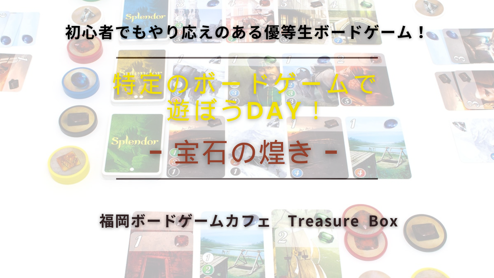 | 会場住所 | 〒814-0011 福岡県福岡市早良区高取1丁目1−17 3階 福岡ボードゲームカフェ Treasure Box(西新・藤崎エリア) |