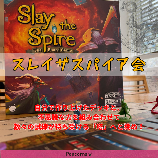 ボードゲームカフェPopcorns*で 『スレイザスパイア会』 を開催します! Slay the Spaire-スレイザスパイア- とは… 大人気デジタルデッキ構築カードゲーム『Slay the Spire』をボードゲーム化した、協力型のローグライク・デッキ構築アドベンチャーゲーム⚔️ 冒険の途中で手に入るカードから毎回異なるデッキを構築し、襲いかかる怪物を倒しながら塔を登ります! 途中でいずれかのプレイヤーのHPが0以下になってしまうと敗北💀 最上階層に潜むボスを倒すことでプレイヤー全員の勝利となります👑 当日はスタッフがゲーム進行のサポートをいたします!初心者の方でも安心してご参加ください✨