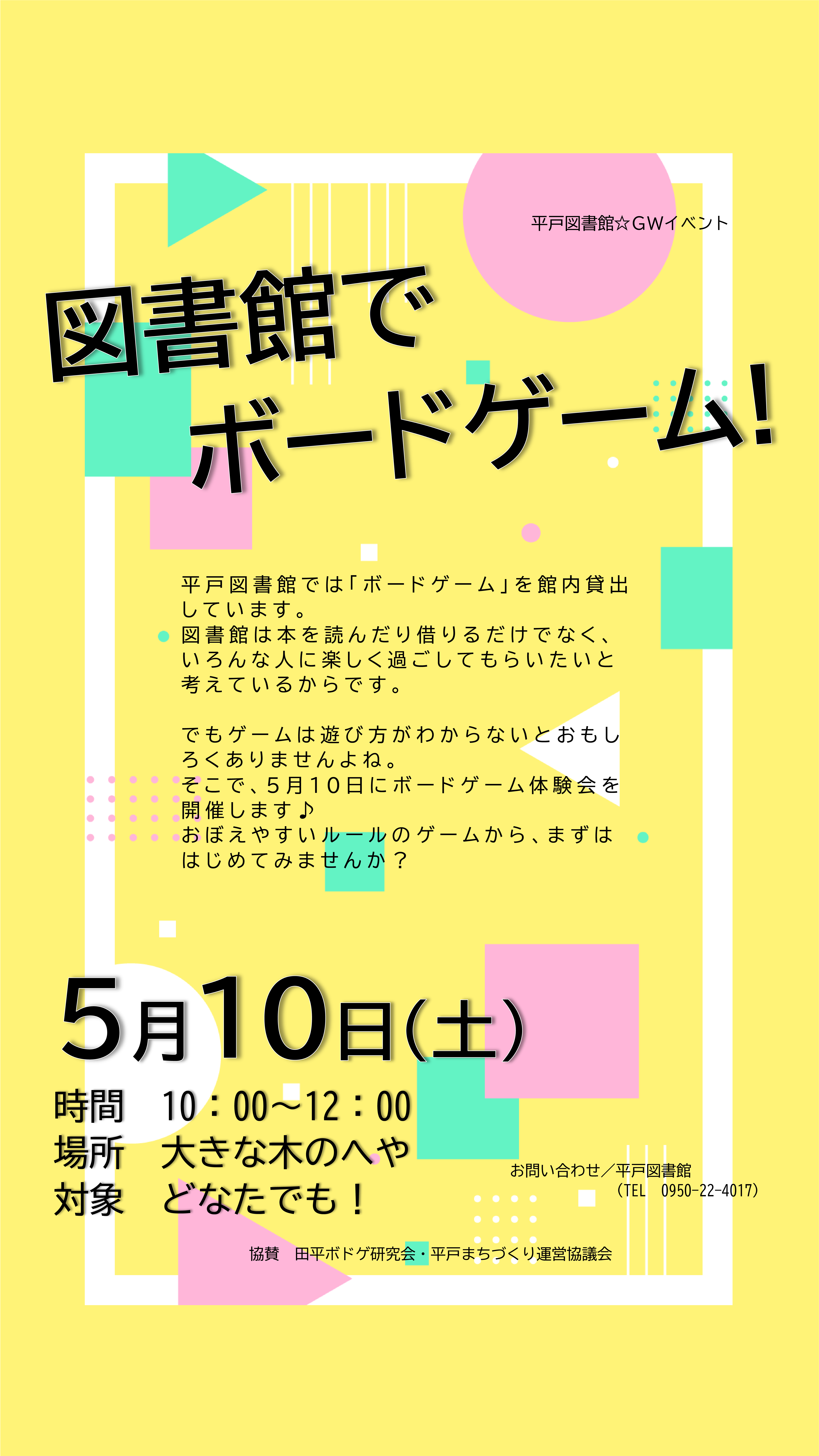 | 詳細内容 | 長崎県平戸市の平戸図書館でボードゲーム会を開催します!平戸図書館には63点ものボードゲームが収蔵されており、これらのボードゲームを使ってオープンなボードゲーム会を開催します。