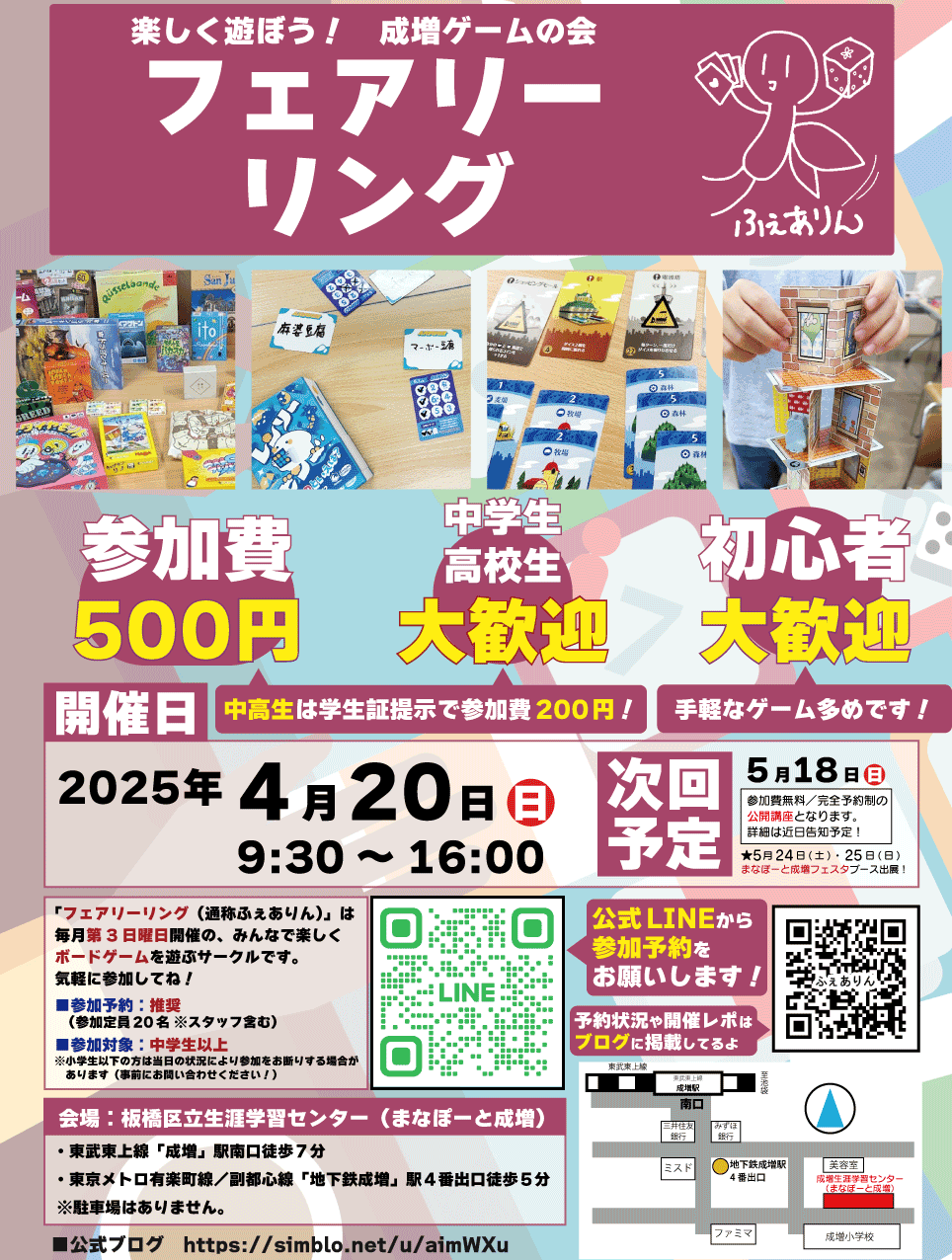 ★「事前の参加予約はしなかったけど、当日に時間が空いたので参加したい!」という場合も、事前にLINE公式アカウント「ボドゲのふぇありん公式」 までご連絡ください。当日の参加状況を見て、参加の可否のご連絡をいたします。ただし、イベント当日はスタッフがイベント運営を行っているため、すぐにお返事できない場合があります。あらかじめご了承ください。