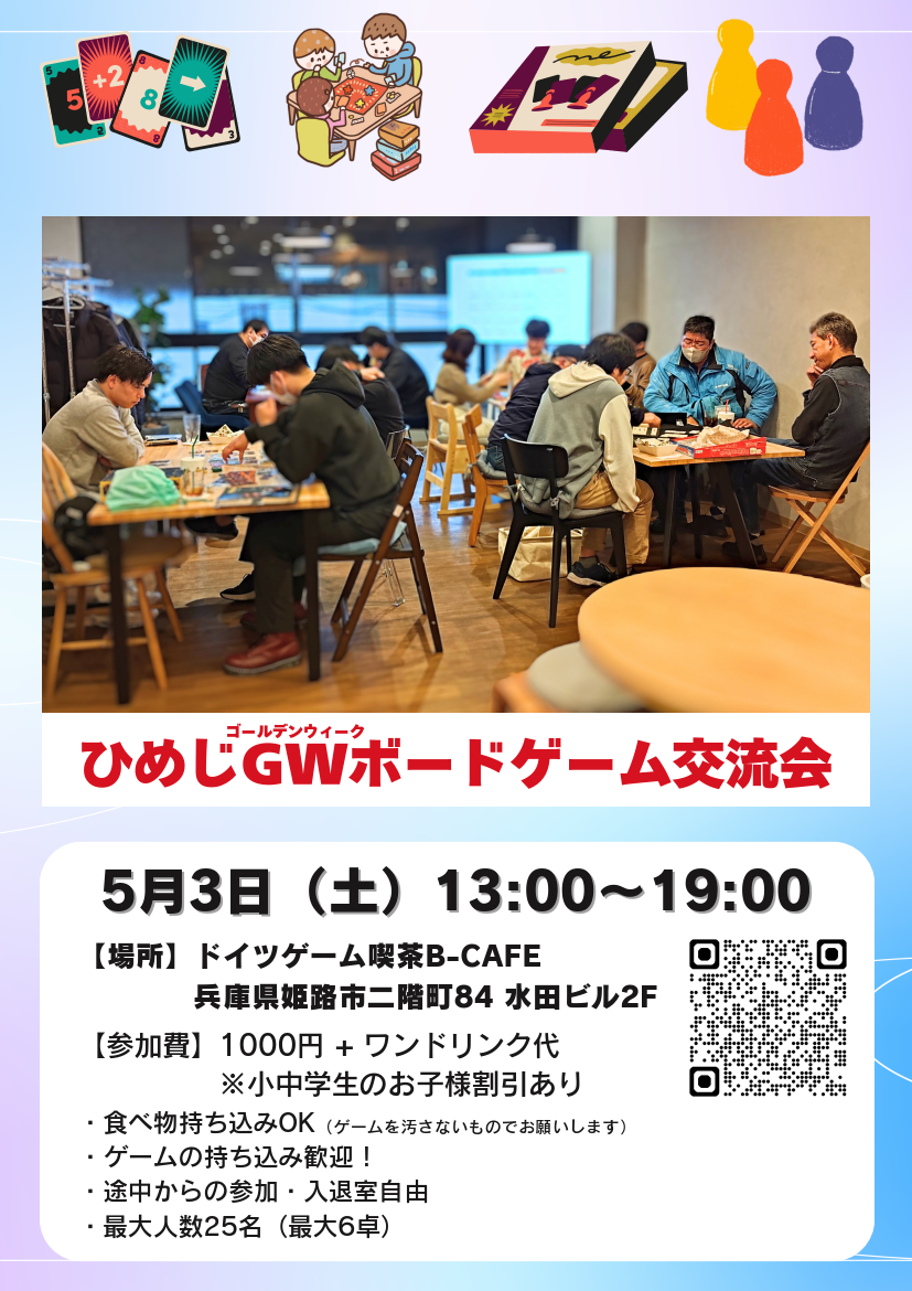 | 会場住所 | 〒670-0922 兵庫県姫路市二階町84 水田ビル 2F ドイツゲーム喫茶 B-CAFE(姫路) |
