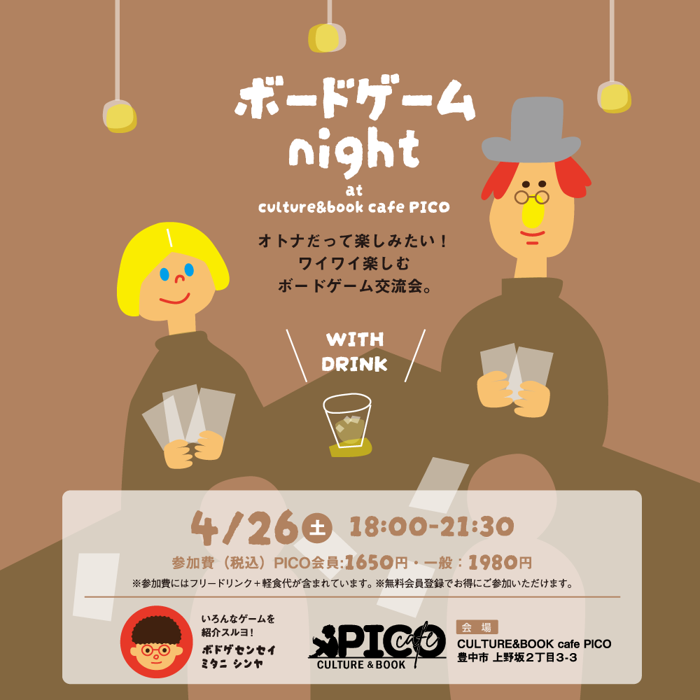 オトナだって楽しみたい! 世界的コミュニケーションツールであるボードゲームを用い、 ボードゲームに興味がある方も無い方も。 夜のひと時を、ゆったりとご一緒しませんか。 ★ご予約はこちらから★ ※ご予約には会員登録が必要ですが、ご予約無しでも当日参加可能です。 【日時】2025年4月26日(土)18:00~21:30(開場17:00) 【会場】カルチャー&ブックカフェPICO 【参加費(税込)】 ・定員は特に設けておりません。 ※会場は飲食店なので飲食物等の持込みはご遠慮ください。 皆さんとご一緒できる事を楽しみにしております♪ |