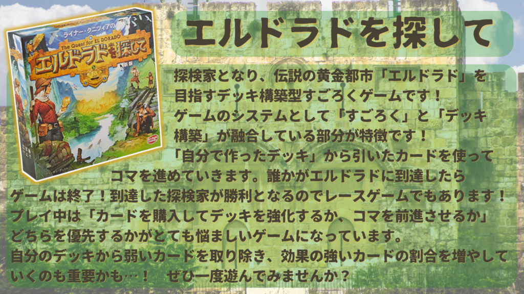 | 詳細内容 | 「エルドラドを探して推し会」「エルドラドを探して」をみんなで遊ぼうの会です! 【日程】4月19日(土) 14:00~23:30 (何時に来てくださっても大丈夫ですが この「○○推し会」はINTALES Cafe(インテイルズカフェ)が毎週土曜日定期で開催するボードゲーム会です。