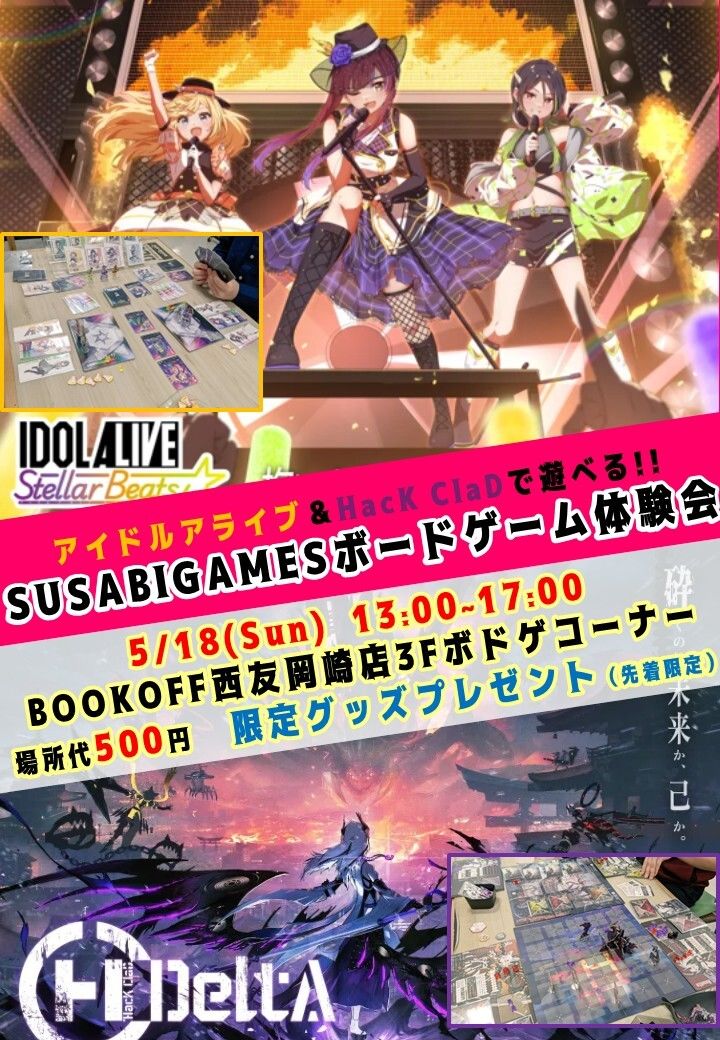 SUSABIGAMESボードゲーム交流会日時:5/18(日) 13:00~17:00 アイドルアライブやハッククラッドでお馴染みの 遊べるゲームは主に次の4つ! ルールがわからなくて参加しづらい方でも大丈夫です!スタッフがルールを丁寧にお教えいたします! スケジュール