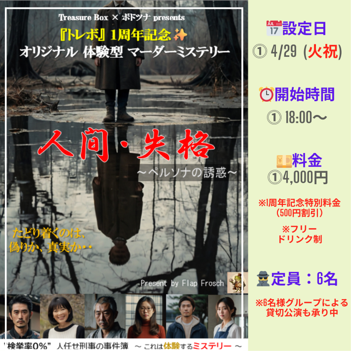 | 詳細内容 | Treasure Box(トレボ)用に書き下ろされた「オリジナルシナリオ」の 店内探索型マーダーミステリー『人間・失格 ~ ペルソナの誘惑 ~ 』 4月公演のお知らせです!
