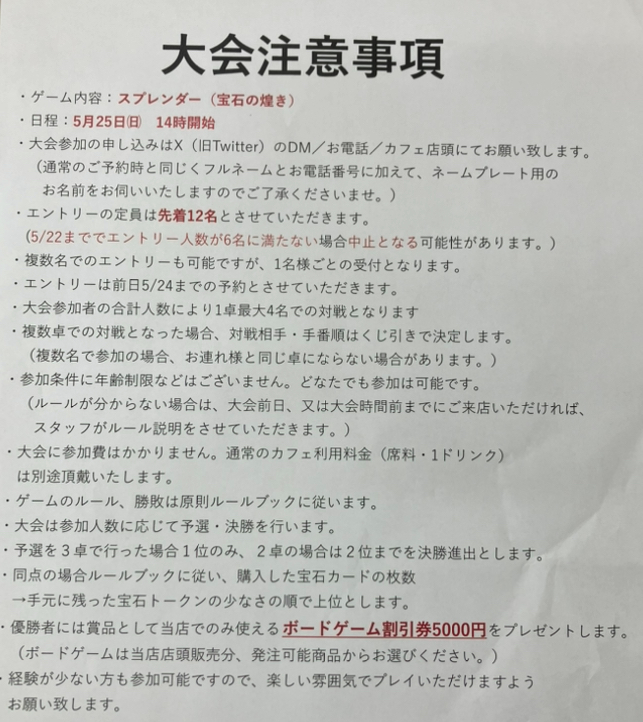 大会は予選と決勝の2回戦行います 予選は1卓最大4名(参加人数によって変動)で予選での勝者1名(参加人数が8名以下の場合は上位2名)までが決勝に進み、決勝で勝利したプレイヤーを優勝とし、優勝商品として 『当店のみで使えるボードゲーム割引券5000円分』をプレゼントします! 大会で使用するのは『基本セット』のみです。拡張は使用しません。 当日の卓はくじ引きによって決定します。 5月22日(木)までに参加者が6名未満の場合大会が中止となる可能性があります。その場合Xのポストでのご案内とエントリーされたお客様には直接ご連絡させていただきます。 初心者でも参加可能です。ルール説明が必要な場合は大会開始2時間前までにご来店いただければご説明いたします。(大会より前の日であれば営業時間中いつでもOKです) 大会のご参加はご予約が必要です。 ご予約はブックオフ栄スカイル店へのお電話か当カフェXのDMやLINEにお名前、お電話番号、当日用のプレイヤーネームをお伝えください。 電話 052-238-3362 X(旧Twitter) https://mobile.twitter.com/bookoffbodoge