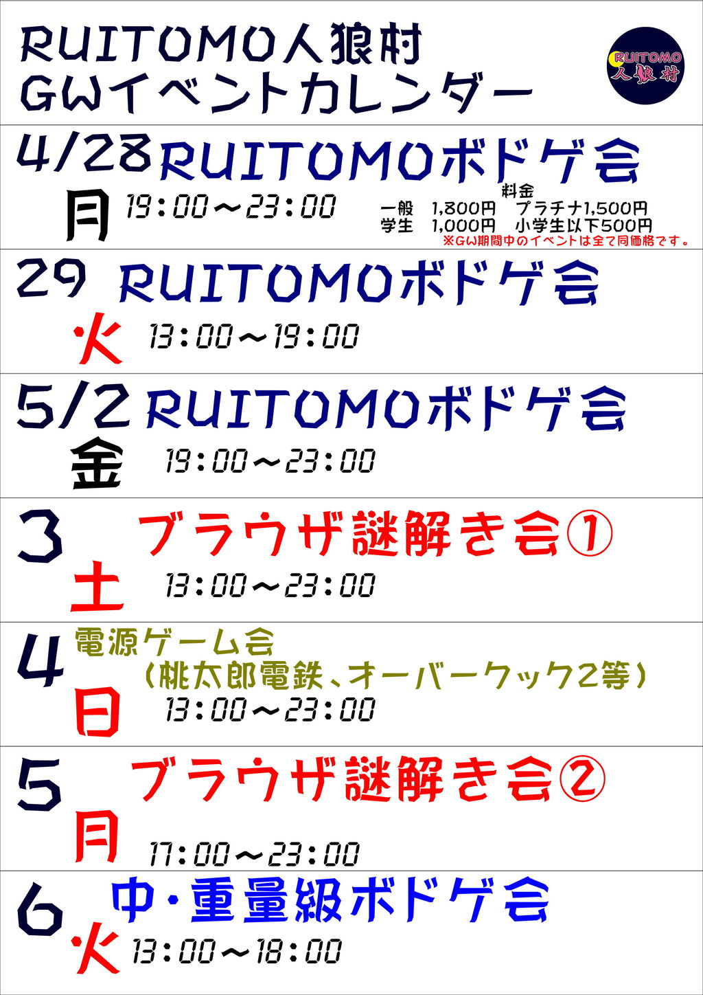 | 会場住所 | 〒930-0017 富山県富山市東田地方町1丁目4−20 福山ビル 2f 富山市東田地方1丁目4-20福山ビル2F(RUITOMO人狼村) |