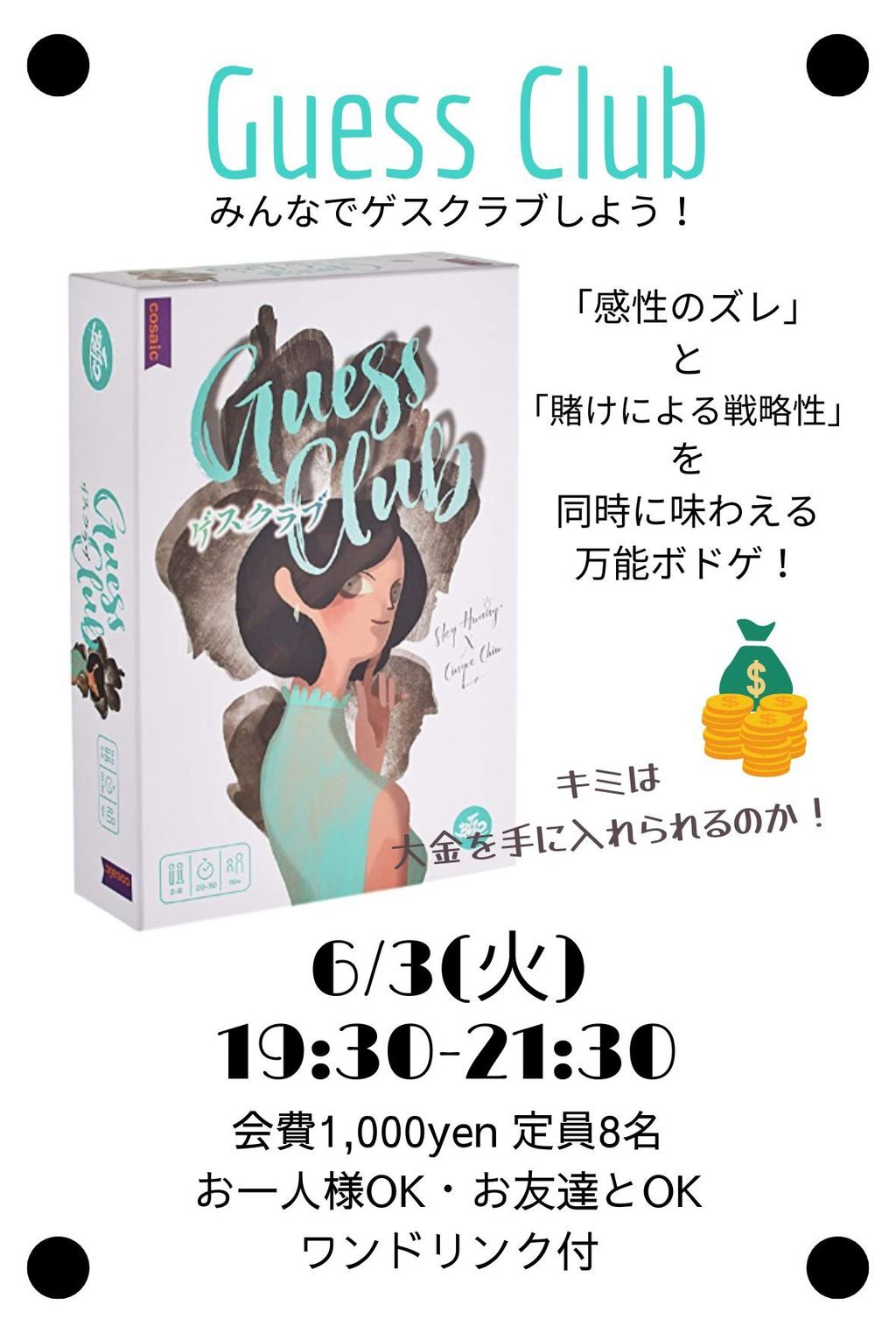| 詳細内容 | 過去満枠にもなっているロングラン人気イベント! 💰平日ゲスクラブ会 ※ボドゲーマからの予約は受け付けておりません。参加希望者は上記の申し込み方法から必ずお申し込み下さい。