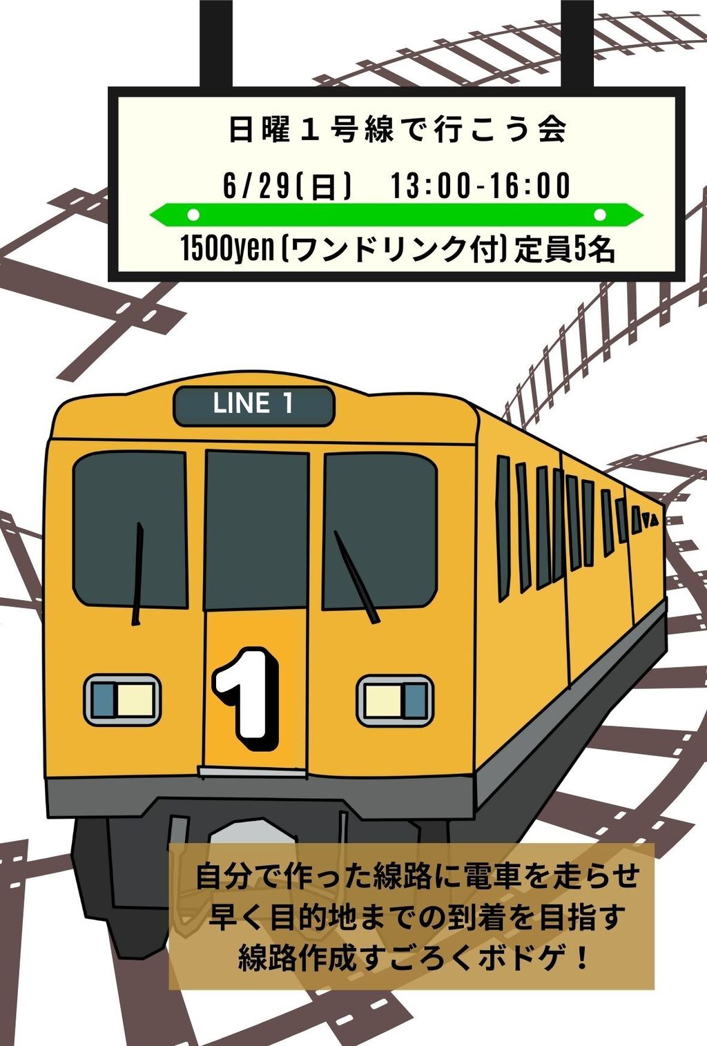 | 詳細内容 | 初開催の新イベント! 目的地を通るように自分で線路をつなげ、その後のすごろくで早くゴールすることを目指す線路作成×すごろくボドゲ! 2段階ある要素で楽しめるボドゲでワイワイ盛り上がること間違いなし! 🚃日曜1号線で行こう会【NEW!!】 ※ボドゲーマからの予約は受け付けておりません。参加希望者は上記の申し込み方法から必ずお申し込み下さい。