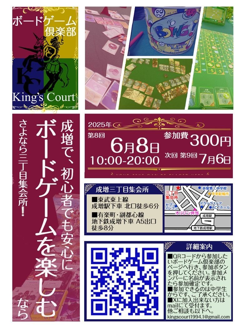 🌸みんなで遊ぶ、ちょっと特別なゲーム会へ🌸 はじめての方、おひとり参加の方も大歓迎! いろんなゲームが集まる、ちょっとにぎやかな1日です。 「気になるけど…」という方も、ぜひ気軽に遊びに来てください! この会では、みんなで少しずつ協力して、心地よい場をつくっています。 朝の設営や夕方の片付けなど、お時間に余裕のある方はぜひお力添えくださいね。(もちろん無理のない範囲で!) ⸻ 🎲イベント概要 開催日:2025年6月8日(日) 場 所:成増 三丁目集会所 第一洋室 (東京都板橋区) 時 間:10:00~20:00 (出入り自由/部分参加の方は事前申告をお願いします) 参加費:300円 (受付で現金にて) 今回は6月June brideにちなんで2人以上で参加の方に割引券をプレゼント!その場で使っても良し!次回以降も使えます、お気軽に遊びに来てくださいね! そして、参加者4-8名で開催、ミスターダイヤモンド、取ってけ!僕のダイヤモンド!大会を開催予定です。 本物の中にある偽物のダイヤを取らないように、1人ひと手番ずつダイヤモンドを取っていって、最もダイヤモンドを獲得した人が優勝という簡単なゲームです。ミスターダイヤモンドを知らなくても遊べます。その後は参加者さんの人数に応じて遊びましょう♪̊̈♪̆̈🌸 ご参加、お待ちしております! ⸻ 📌ご案内とお願い ・中学生以上の方が対象です (中学生は19時まで) ・清潔な服装でお越しください。デオドラントのご配慮をお願いします (香水は控えめに) ・制汗シートを受付とトイレにご用意しています。使用後のゴミは紙ごみ袋へどうぞ ・マスク着用は任意ですが、混雑時などにはご協力ください ・飲み物は蓋付きのものをご用意ください ・食べ物はお昼(12:00~13:00)以外は、匂いの強くない一口サイズ・個包装のもののみ可。できるだけテーブルの外側を向いてお召し上がりください ・お菓子はご自由にどうぞ!持ち込み・リクエストも歓迎です ・ゴミは各自お持ち帰りをお願いします (受付でゴミ袋を1人1枚まで配布) ・ゲームのカードや駒は丁寧に扱いましょう(トントン叩きや曲げは禁止です) ・同人ゲームの持ち込み歓迎!(コードGのみ/未販売作品もOK) ※無理なプレイ勧誘はご遠慮ください。悪質な場合は参加をご遠慮いただくこともあります ・販売や頒布行為は不可です ・当日は名札の着用をお願いします(手作りOK/名前部分は名刺サイズ以上) ・持ち込みゲームは、事前にゲーム持ち込み登録、もしくはXの投稿へリプライいただけると助かります ・宗教やマルチ商法、出会い目的などの勧誘は禁止です ※他のオープンなゲーム会(ボドゲーマ等掲載済み)へのお誘いはOK、名刺等をご活用ください ⸻ 👑現在持ち込み予定の同人ゲーム(King’s Court) ・ワンダフル映画祭+拡張(2009年初版) ・怪獣ファイト(2004年初版) ・ダイナゲイル(2002年初版) ■テストプレイ(予定) ・の~べ~デザインの新作ゲームのテストプレイを予定しております!へのつっぱりはいらんですよ! ⸻ 🌼最後に🌼 いくつかお願いごとはありますが、どれも楽しく過ごすための工夫です。 次回も「また来たい!」と思ってもらえるような場を、みなさんと一緒につくれたら嬉しいです。 お気軽にご参加ください! 🌸現在の持ち込みゲーム🌸 1. フィンスパン 2.ダンス・オブ・アイベックス 3.スーパーメガラッキーボックス 4.まっぷたツートンソウル1&2 5.ピクチャーズ 6. レンソービンゴ 7. トレンディ 8. ザ・ゲーム 9. 宝石がいっぱい 10. ラブレター 11. ニムト 12. コードネーム 13. 囚徒たちの夜 14. インサイダー・ゲーム 15. ワンナイト人狼 超人ver 16. もっとホイップを! 17. まじかる☆パティスリー 18. フロリフェラス 19. ハーベイジャス 20. ダッジーマッジー 21. ドミニオン・繁栄 22. ドミニオン・陰謀 23. ドミニオン・錬金術 24. ドミニオン 25. 新版 ぬくみ温泉繁盛記 26. SAKURA FRONT 27. Lunar Trick 28. 群青グラデーション 29. アルケミストのアトリエ 30. まじかる☆ベーカリー 31. ミラリス 32.魔王大戦ブットバクラッシュ 33.チョコっと密輸 34.ラピストル 35.ジュエルマイスター 36. 海底探検 深版 37.ダーウィンズ・ジャーニー 38.クアックサルバー 39.ミスターダイヤモンド 40.ようせいさんポーズ ようせいさん別次元ver 持ち込みゲーム追加予定☆☆☆ クイズすごろくかぶーる ラストチャンス シンシナティ スロットブラザーズ □June bride□ ローマ神話の女神ジュノーは結婚や出産をつかさどる女神とされ、6月を彼女の守護月とされています。そのため、6月に結婚するとジュノーの加護を受け、幸せになれると信じられています🌸 ★欄外お知らせ 次回からは会場が東武東上線成増駅降りてすぐのActホール5階洋室へ変更になります。 諸々変更になりますが、宜しく願いいたします🌸 |