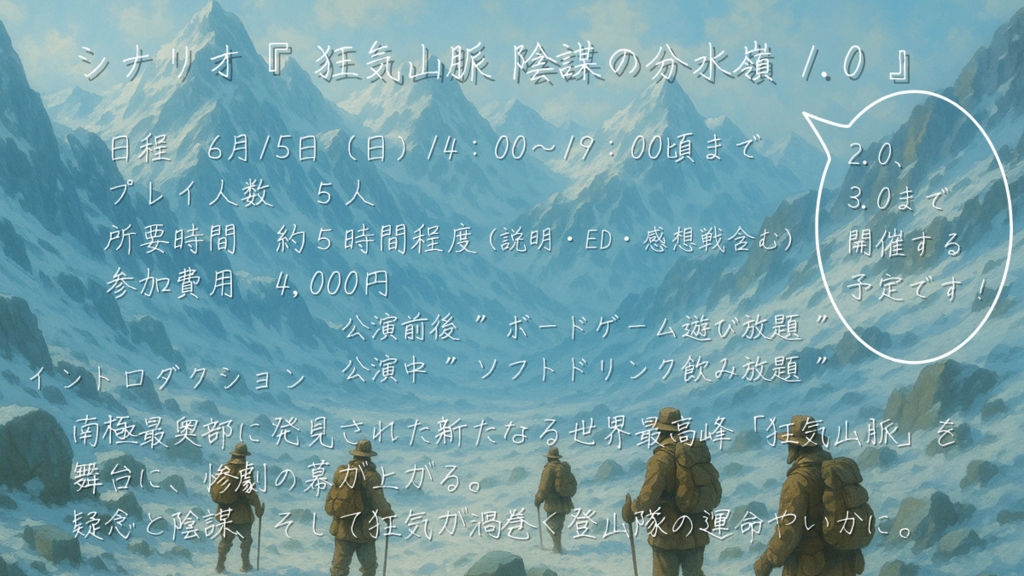 【 あらすじ 】 南極最奥部に発見された新たなる世界最高峰 「狂気山脈」を舞台に、惨劇の幕が上がる。 疑念と陰謀、そして狂気が渦巻く登山隊の運命やいかに。 【 シナリオ概要 】 シナリオタイトル:『 狂気山脈 陰謀の分水嶺 1.0 』