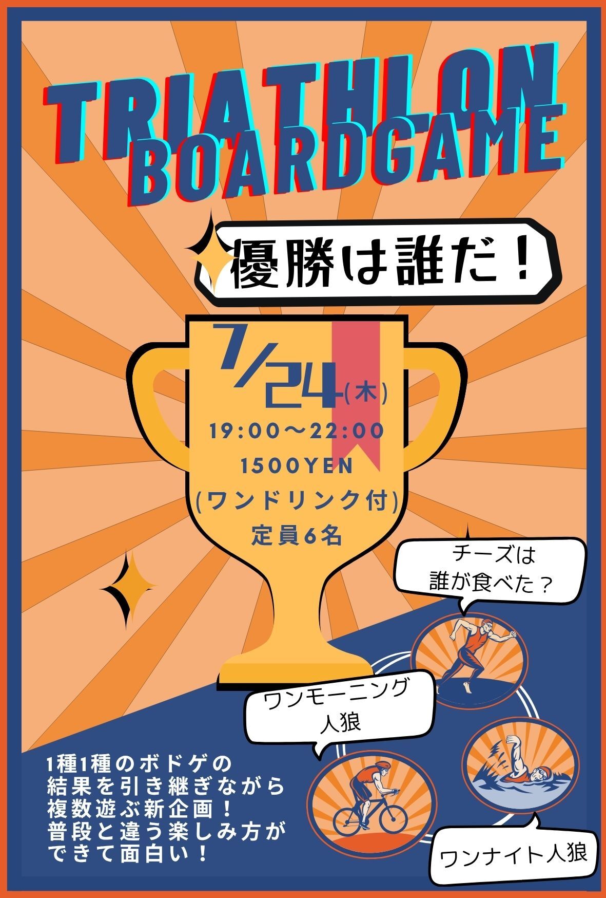 | 詳細内容 | 前回好評の特殊イベント! 今回は「ワンナイト人狼」「ワンモーニング人狼」「チーズは誰が食べた?」の3種類を楽しみます! 新感覚の遊び方で楽しみませんか?? 🔝ボドゲアスロン会 ※ボドゲーマからの予約は受け付けておりません。参加希望者は上記の申し込み方法から必ずお申し込み下さい。