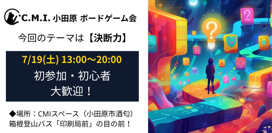 オープン会は大学生以上を推奨に、小学生以上なら誰でもご参加いただけるボードゲーム会になります。 初めてボードゲームを遊んでみたい方や、 そんなに長く時間を取れない方でもお気軽にお遊びいただけます。 13:00~20:00での開催になりますが、途中での帰宅はOKです。 お一人様 OK 初心者 OK 途中参加 OK 途中退場 OK グループ参加OK ◆料金: フリータイム制 2,000円(税込) 今回のテーマは【決断力】 ゲームを遊んでる中でも、絶えず「決断」をしているんです。でも、意識していない。だから、実生活の中での「決断」に活かせない。せっかくだから、遊びの中で培ったスキルを実生活にも役立てよう!今回は「決断」を意識してゲームを遊んでみてください! ゲーム中、判断材料が足りない中でも「決断」した経験が、きっと実生活の中でも役に立つことでしょう。