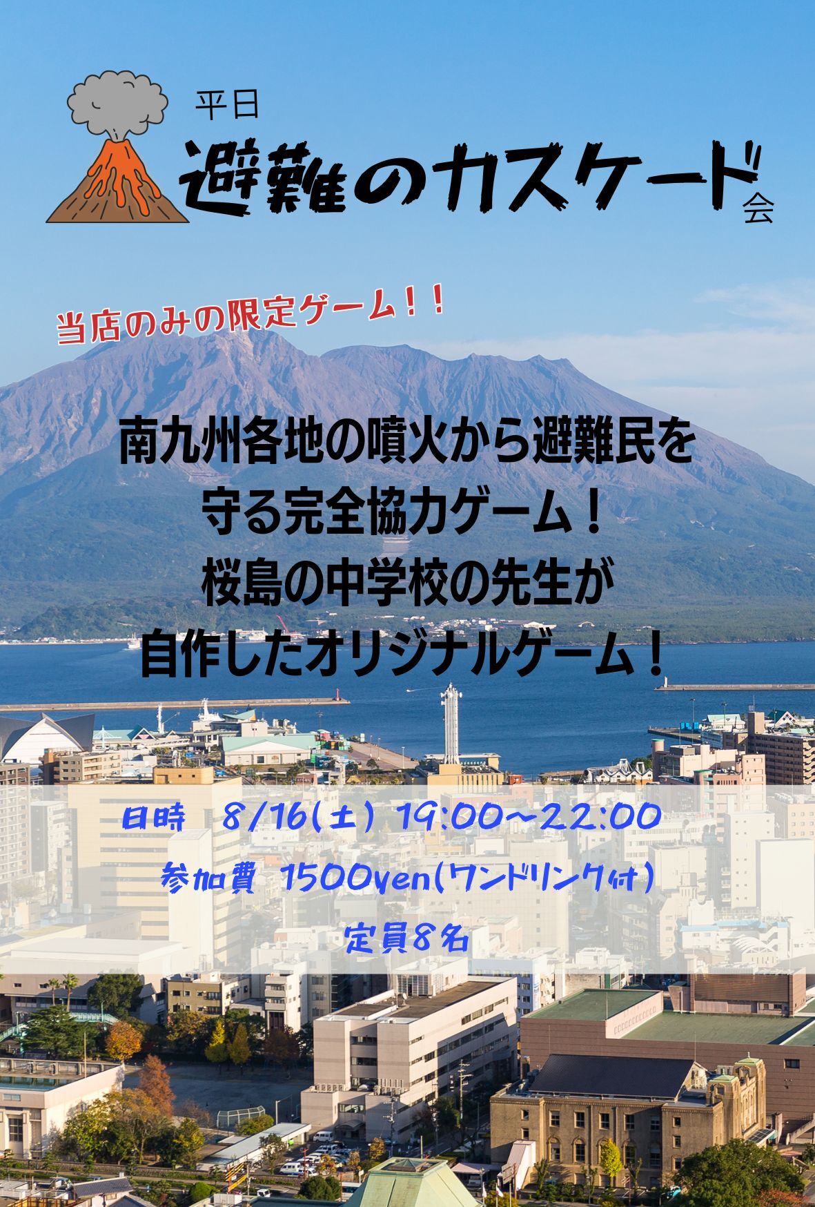 | 詳細内容 | 前回好評イベントが約8カ月ぶりに復活開催! 南九州各地の噴火から避難民を守る協力ゲーム! しっかり考えないとあっという間に被害が拡大してしまうので、仲間との協力が不可欠です! 初めての方も大歓迎!当日は製作者の先生もいらっしゃる予定です! 🌋平日避難のカスケード会【NEW!!】 ※ボドゲーマからの予約は受け付けておりません。参加希望者は上記の申し込み方法から必ずお申し込み下さい。