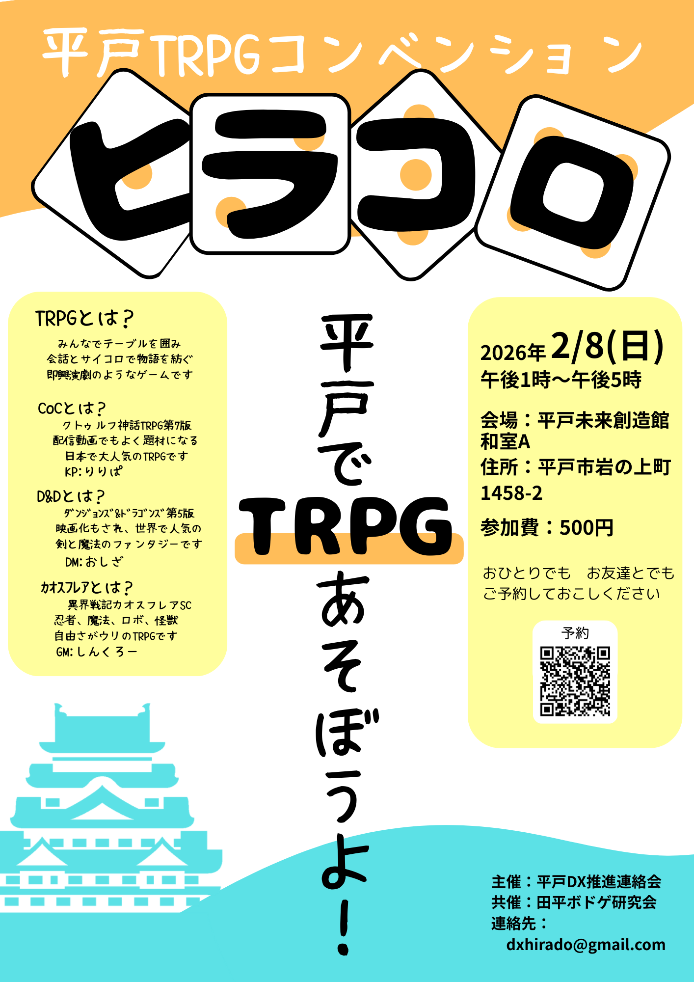 | 詳細内容 | はじめまして!わたしたちは毎週のようにTRPGで遊んでおり、ぜひオープン会も開催したいと考え、「平戸TRPGコンベンション ヒラコロ」を開催いたします。 今回は第二回です! TRPGとは、みんなでテーブルを囲み会話とサイコロで物語を紡ぐ即興演劇のようなゲームです。 マスターは運営が行いますので、お気軽に遊びに来てください。もちろん見学も歓迎いたします。 ご予約フォームはこちらです。事前予約のご協力をお願いします。 第一回の様子はこちらです。