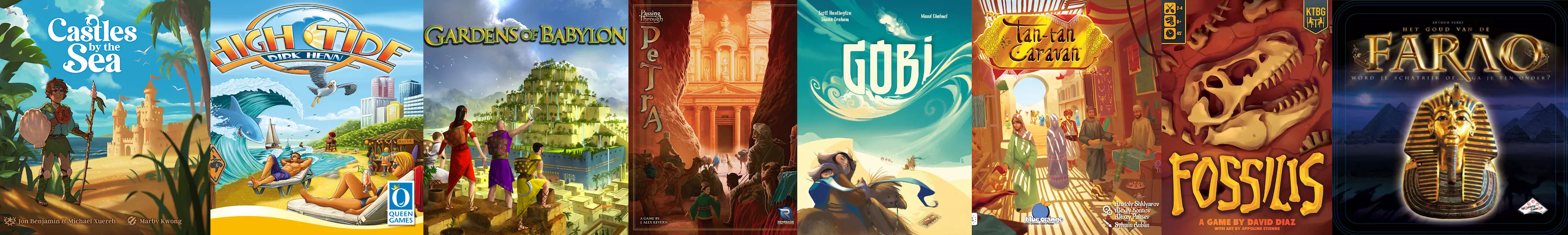 1「castle by the sea / キャッスルバイザシー」・ビーチで砂の城を作ろう。しかしね、君は砂浜に住む小さなショアリングだ。砂の城作りは遊びじゃないんだ。国の威信がかかってるのだ。精進しろ。なゲーム。ブロックを積んで城を作るゲームなんだけど他のゲームと違うところは、城は完成することは多分なく壊されてはまた作りを繰り返すところ。まさに砂上の楼閣。その過程でどのぐらいお金が稼げるかを競うゲーム。過去の遺産をどう使うかが鍵。インパク知。 2「HIGH TIDE / ハイタイド」・ビーチはいいよね。のんびりしたいよね。城造りなんてやってられますかってんだ。ただどうせゆっくりするなら波打ち際の景色のいいとこがいいよね。さあデッキチェアを動かすぞ。そして波に攫われるゲーム(攫われちゃあダメだぞ)。ダイスゲーム。ルールは簡単で俺は好きだぞ。バカパク。 3「GARDEN OF BABYLON / ガーデンオブバビロン」・世界七不思議と言えばバビロンの空中庭園。砂漠に美しい庭園を作り上げよう、ではなくて、庭園の水利権を巡って仁義なく争うゲーム。上流を抑えれば下流の庭園の敵の花は枯れて君の花が咲く。タイルをうまくつなげよう。割と軽め。バカシブ。 4「Passing Through PETRA / パッシングスルーペトラ」・新世界七不思議と言えばヨルダンのペトラ。何kmも続く細い峡谷の先に突如として現れる燦然たる都、それがペトラだ。交通の要衝ペトラには多くの商人が訪れる。君はペトラの要人として、俺が一番すごいことを知らしめるのだ。そのためには商人の列をうまく捌く必要がある(峡谷は狭いので渋滞がひどい)。インタラクトは少なめ。ペトラの大渋滞は一見の価値あり。隠れた名作っぽい。比較的重め。シブ知。 5「GOBI / ゴビ」・ゴビ砂漠。何もなさそうな砂漠だが、ここには隊商の拠点が点在しているそうな。それをうまーく繋げて得点しようなゲーム。コーヒーは貴重品だぞ。ラクダを配置して線にするのだ。パズル系だ。軽めだけど脳が疲れるはず。シブ知。 6「TAN TAN CARAVAN / タンタンキャラバン」・砂漠の交易所のゲーム。カードを買って並べていっぱいになったらみんなに配分、な実にゲーム的なゲーム。ゲームシステムの理解が勝敗を分ける思考ゲーム。ゴビとは違う思考を要求される脳が疲れるゲーム。軽め。シブ知。 7「FOSSILIS / フォシルス」・舞台はゴビ砂漠かはわからないけど化石を掘るゲーム。君にはパワーがあるので、相手を穴に落としたり崖から転落させたりできるが、これはそういうゲームではないので大人しく化石を発掘しよう。ピンセットで穴から骨を取り出す。これがこのゲームのハイライトだ。骨を集めて恐竜たちに思いを馳せよう。そしたら研究機関に売り飛ばして点を稼ぐのだ。インパク知。 8「Het goud van de Farao / ゴールドオブファラオ」・レッツ盗掘。ファラオのピラミッドに入って貴重品を奪おう。写真撮影だけ? ならなんでツタンカーメンは怒ってるのさ。君と助手をうまく操って道を切り開け。そしてライバルは閉じ込めろ。最後は必ずピラミッドは崩壊して終わる(得点さえあれば君が帰らぬ人になっても勝てるよ)。軽め。バカパク。 参加してくださる人のゲームの持ち込みは大歓迎です。ただテーマをある程度は考慮して持ってきてね。テーマとは無関係なゲームは遊ばないとしても文句は受け付けないぞ。テーマをどこまで拡大解釈するかは君に任せる。テーマと関係あるゲームの場合は、どのゲームを遊ぶかみんなで決めましょう。私の用意したゲーム優先だ、とかではありません。