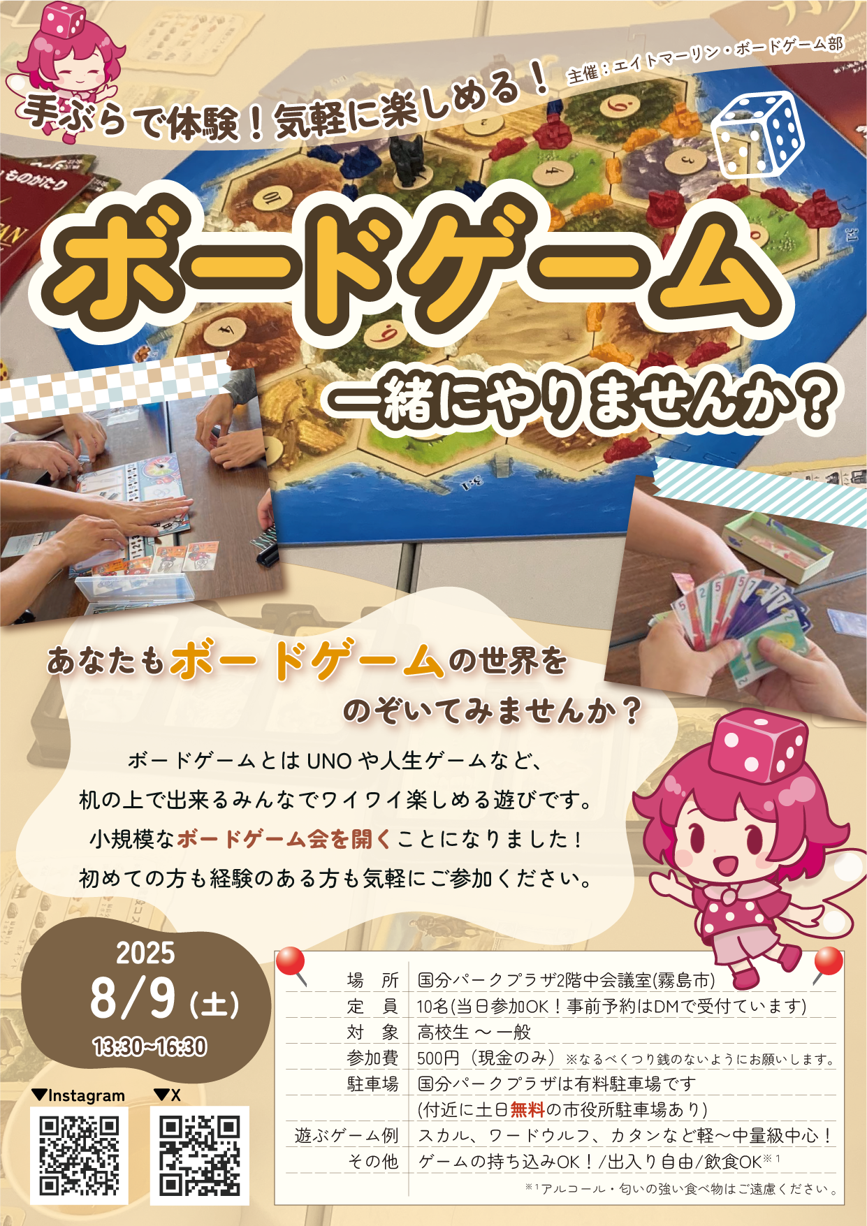 | 詳細内容 | 【霧島市】8/9(土)第3回 ボードゲーム会開催!初心者歓迎🎲