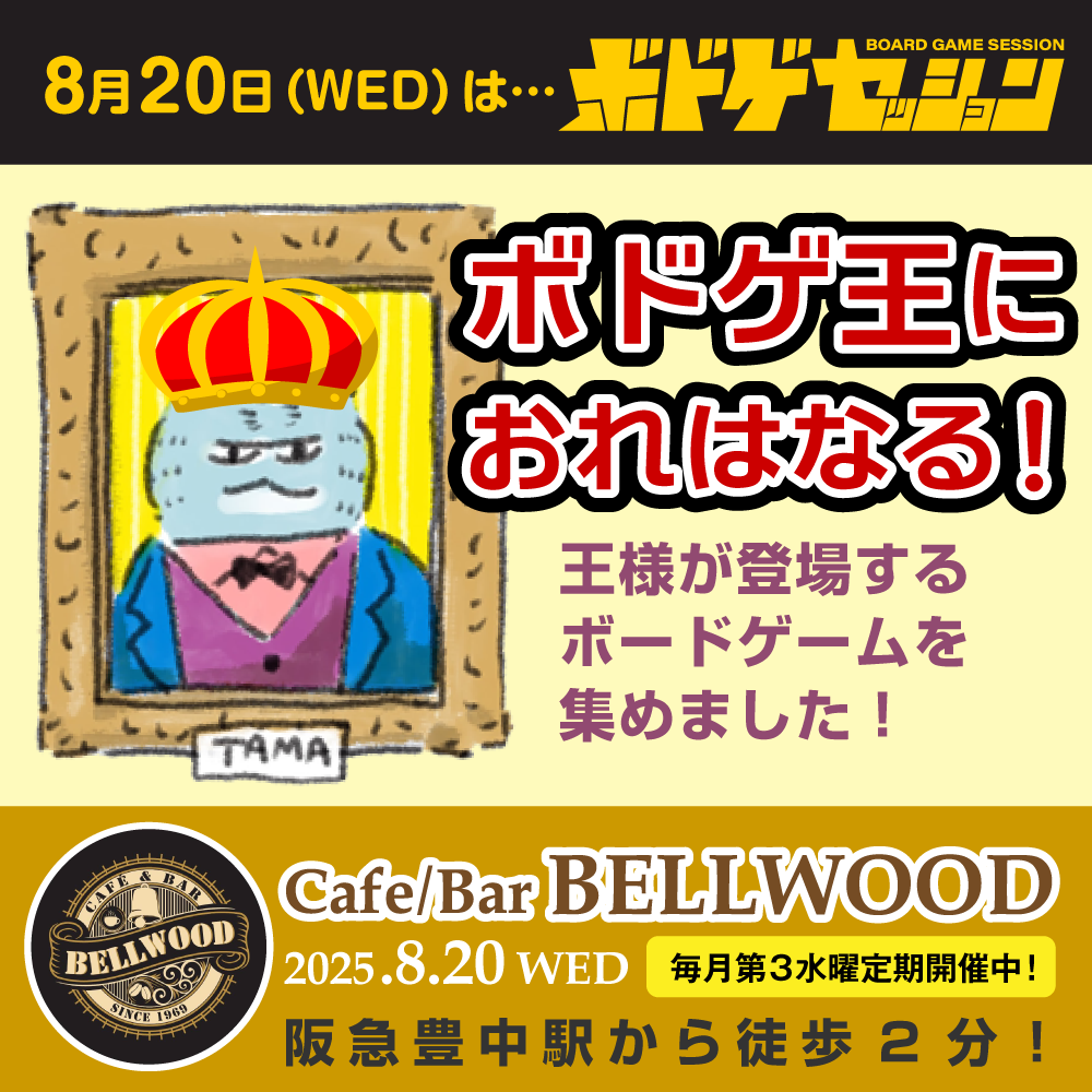 世界のボードゲームを、みんなでセッションしようの集いです。 今回の会場は豊中駅から徒歩2分! ★テーマは『ボドゲ王におれはなる!』★ ■セットリスト(☆はテーマ作品) ※セットリストは、変更・追加される事があります。 【日時】2025年8月20日(水)18:30~22:30 【会場】Cafe/Bar BELLWOOD 【参加費】1,000円+ワンドリンクお願いします。 ・定員は特に設けておりません。 皆さんとご一緒できる事を楽しみにしております♪ |