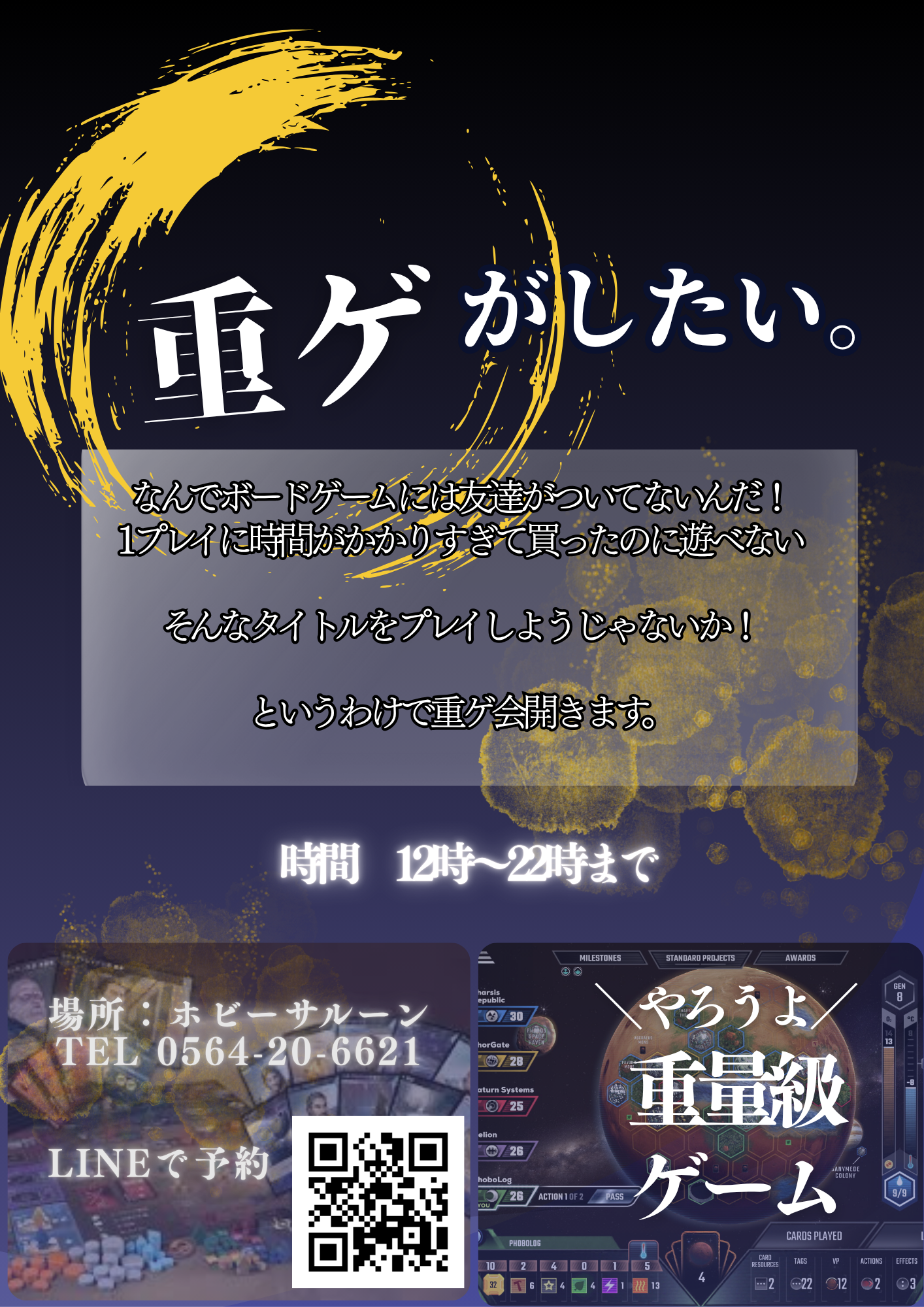 | 詳細内容 | 重ゲー好きによる重ゲー好きのための重ゲー会 自分がインスト含めやるから!! というゲームでも一緒にプレイしますよ 1プレイ2時間超え どんとこい 初心者にお勧めできるかは… わかりませんが 出来るだけ初参加の方にも優しく伝えられるよう頑張ります!