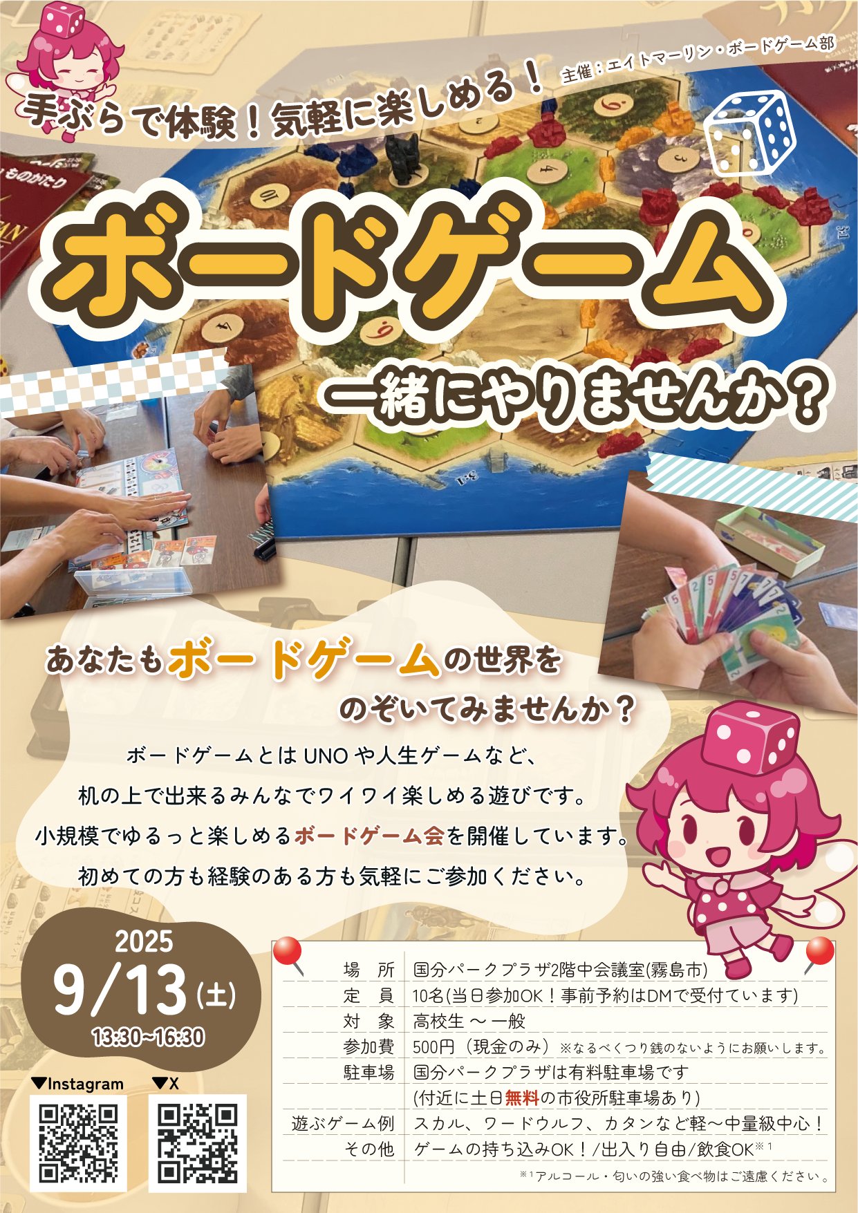 | 詳細内容 | 【霧島市】9/13(土)第3回 ボードゲーム会開催!初心者歓迎🎲
