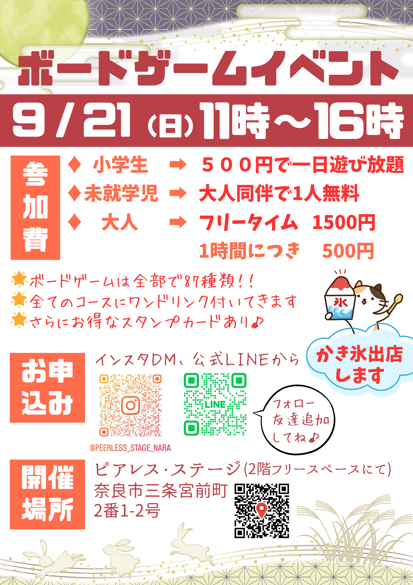 â é嬿é11ïŒ00 ïœ 16ïŒ00ãŸã§(æçµå仿éã¯15ïŒ30ïŒâ åå è²»ãå°åŠçâ¡ 500åã§äžæ¥éã³æŸé¡æªå°±åŠå ⡠倧人å䌎ã§ïŒäººç¡æå€§äººâ¡ããªãŒã¿ã€ã 1500åãããã¯1æéã«ã€ã500åâ»åå è ã«ã¯ãããªã1ããªã³ã¯ãµãŒãã¹âªð9æãããæ°·(200å)åºåºâªâ»ãããã³ã°ã§ç ä¹³+50å â éå¬å ŽæïŒãã¢ã¬ã¹ã»ã¹ããŒãž(ïŒéã®å宀ã«ãŠ)å¥è¯é§ è¿ãã西ãžåŸæ©ïŒåâªè¿éæ°å€§å®®é§ ããåæ±ãžããããåŸæ©7å â äºçŽãªãã§åœæ¥åå ãå¯èœã§ãâªâ ã奜ããªããŒãã²ãŒã ã®æã¡èŸŒã¿ãèªç±âªâ泚æäºéã»æªå°±åŠå ã®ã¿ã§ã®åå ã¯ã§ããŸãããå¿ ãä¿è·è å䌎ã§ãé¡ãããŸããã»é£²é£ç©ã®æã¡èŸŒã¿ã¯ãé æ ®é¡ããŸãã(é¢ä¹³é£ãªã©è»œé£ã¯å¯)ã»ããã¯é£²æããããããã«é£²æãªã©è¿œå ã®é£²ã¿ç©ã¯100åã§è²©å£²ããŠãããŸãã
