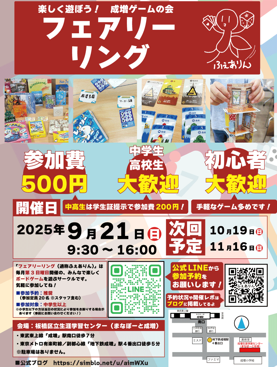 ※当日参加される場合も、事前にLINE公式アカウント「ボドゲのふぇありん公式」 までご連絡ください