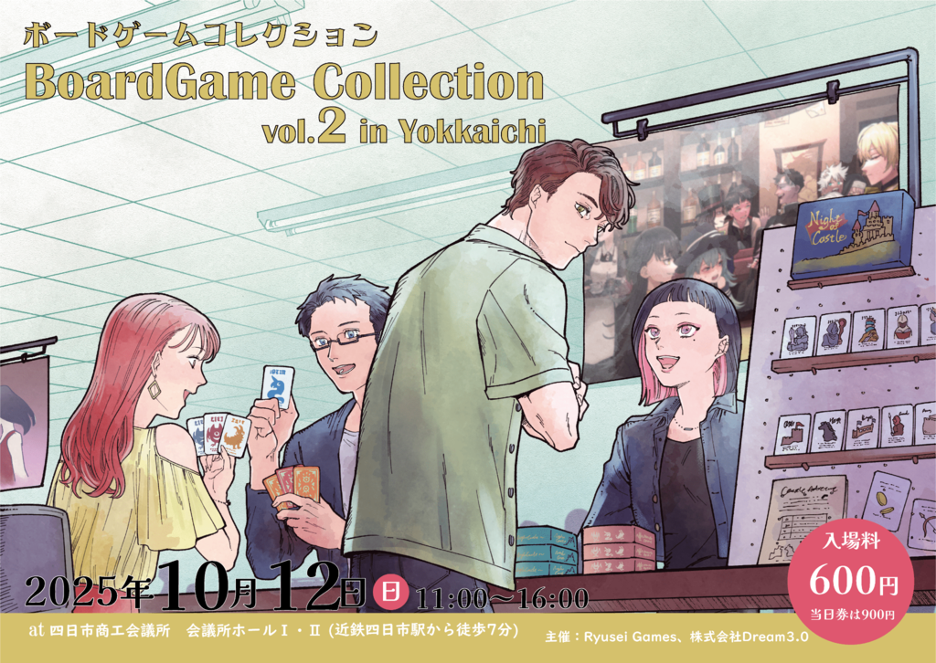 2025年10月12日 四日市市にて大型ボードゲーム即売会を開催します!!日本全国から多数のボードゲームメーカーが出展! なんと来場全員に無料で新作ボードゲームプレゼントあり!!!三重県初の大型即売会イベント!! ここでしか手に入らない新作や特別価格での購入が可能です!実際にボードゲーム製作者からルールやゲームのことを直接聞けるまたとないチャンス!他のイベントには無い特別な大変ができます。 ●来場方法 事前チケットをご購入いただくと、当日スムーズにご案内できます。 事前チケット600円になります。 ↓チケットの購入はこちらから https://t.livepocket.jp/e/4rgjz ●出展者情報 随時更新しておりますが、下記ホームページよりご確認ください。 https://sites.google.com/view/bodocolle2/%E3%83%9B%E3%83%BC%E3%83%A0 ●会場 近鉄四日市駅より徒歩すぐ!! 会場周辺にはパーキング多数!! 名古屋駅から約30分 ・近鉄四日市駅から徒歩7分 ●お問い合わせ先 ryuseigames@outlook.jp その他の「Ryusei Games」への連絡も承っております。 |