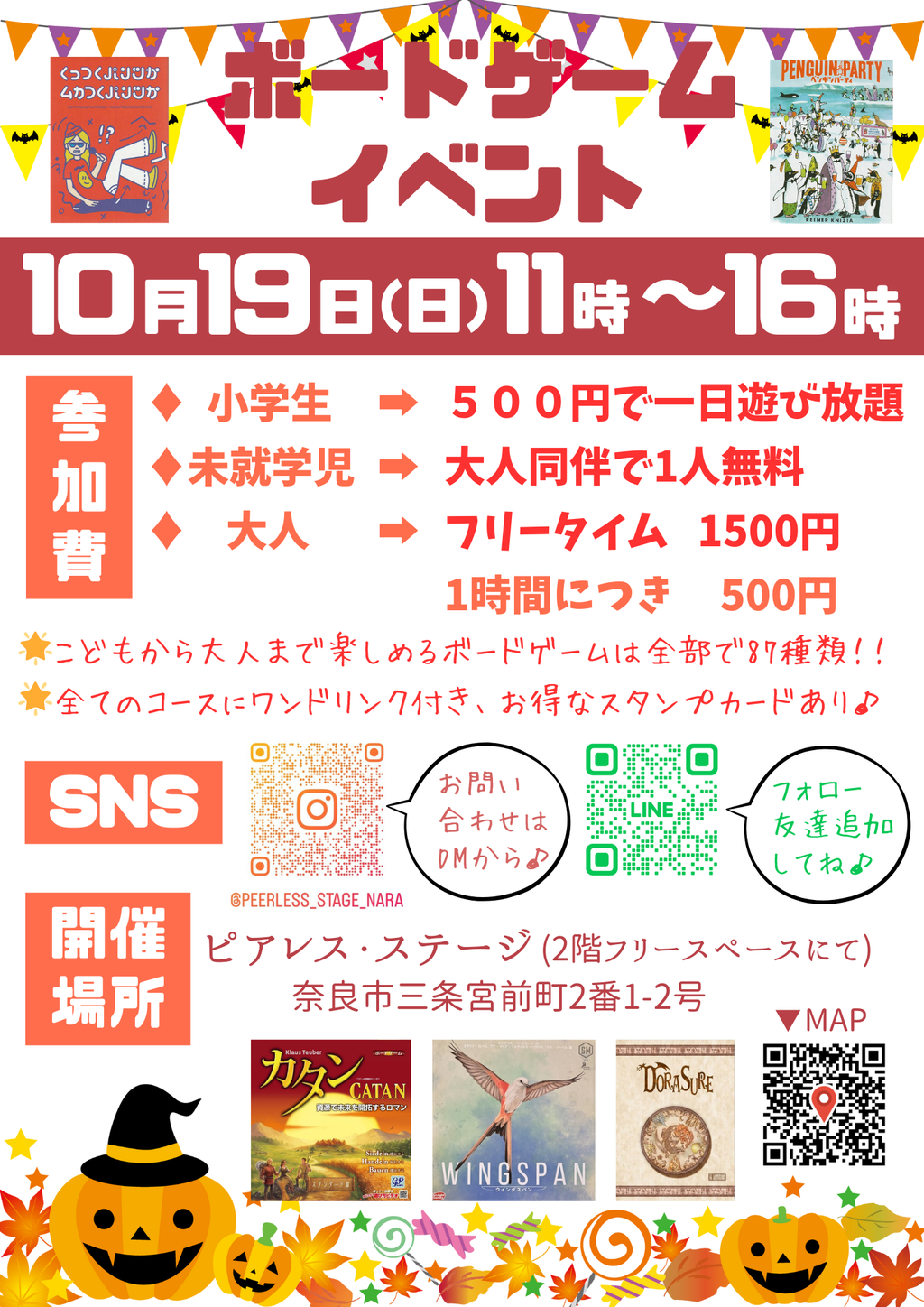 ★開催時間11:00 ~ 16:00まで(最終受付時間は15:30)★参加費小学生➡ 500円で一日遊び放題未就学児➡ 大人同伴で1人無料大人➡フリータイム1500円もしくは1時間につき500円※参加者にはもれなく1ドリンクサービス♪★開催場所:ピアレス・ステージ(2階の和室にて)JR奈良駅近から西へ徒歩5分♪近鉄新大宮駅から南東へおおよそ徒歩7分 ★予約なしで当日参加も可能です♪★お好きなボードゲームの持ち込みも自由♪●注意事項・未就学児のみでの参加はできません。必ず保護者同伴でお願いします。・飲食物の持ち込みはご遠慮願います。(離乳食など軽食は可)・パック飲料、ペットボトル飲料など追加の飲み物は100円で販売しております。