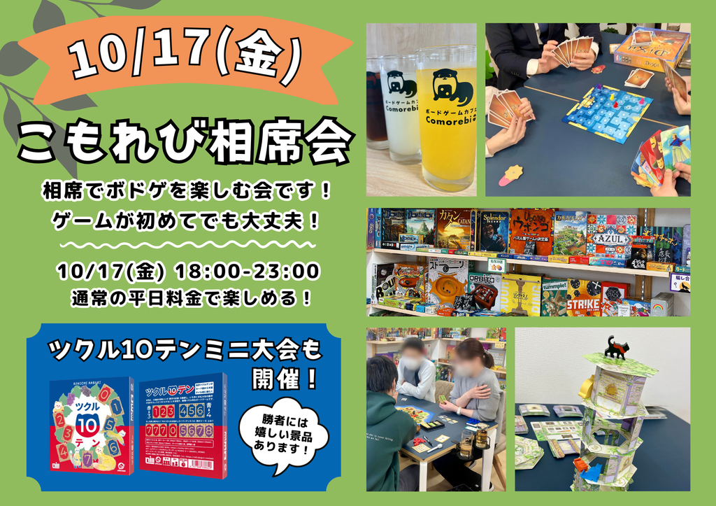 ボドゲ好きなら誰でも参加できる相席会!自分の好みに合わせたゲームでお楽しみいただけます!Comorebi1周年を記念した参加者限定特典やミニ大会も開催!ご参加お待ちしております🎉イベント概要🎊 ・みんなでワイワイ楽しめるボドゲ相席会。