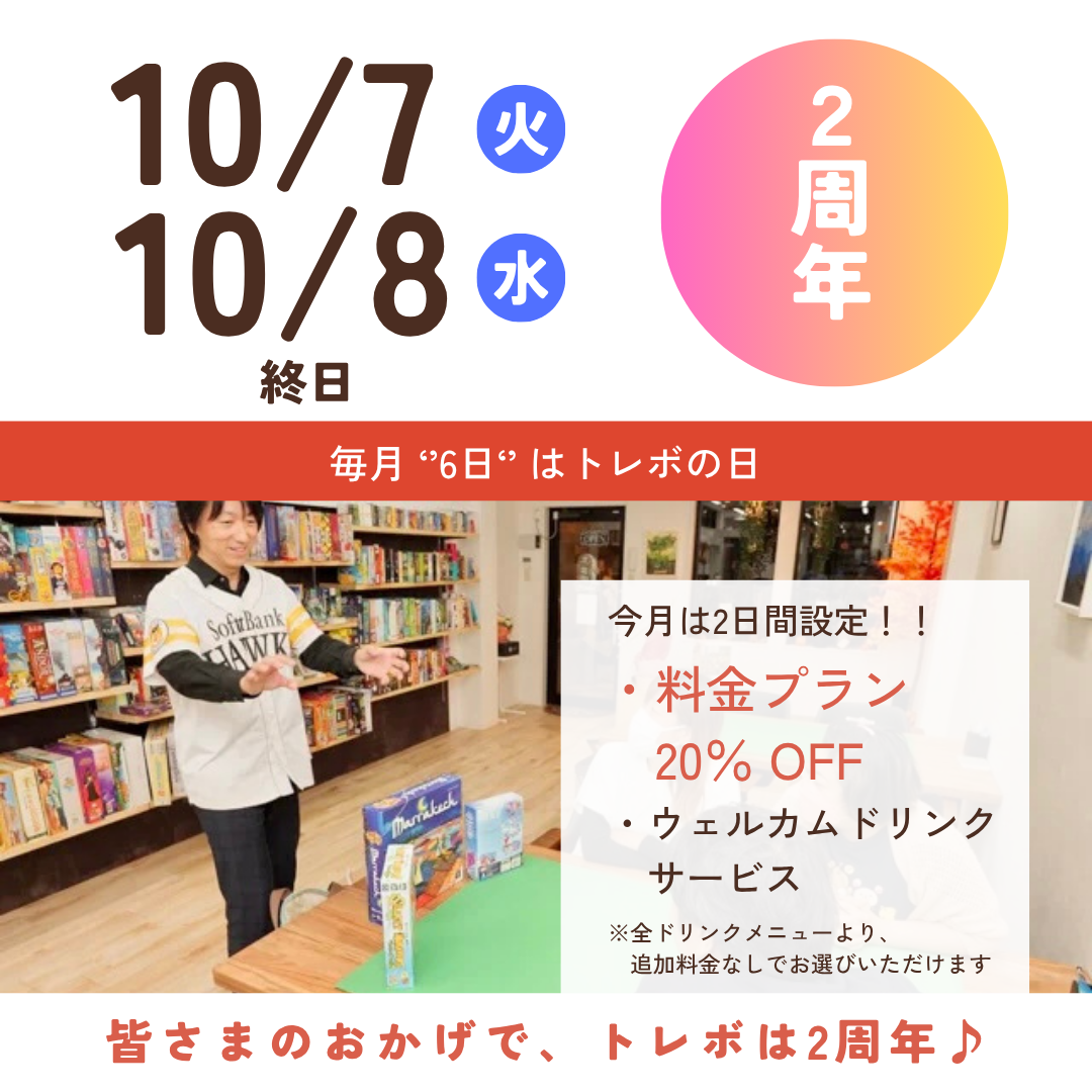 | 詳細内容 | 福岡ボードゲームカフェ Treasure Box(トレボ)は、2025年10月6日で《 2周年 》を迎えます✨ そこで、2周年にちなんで、10月7日(火) ~ 19日(日)までの2週間を、 《 トレボ2周年記念キャンペーン 》として、これまでご愛顧いただいている既存(リピーター)のお客様、キャンペーン期間中に初めてお越しになる新規のお客様と一緒にお祝い感を共有したいと思っております。 7日(火)・8日(水)はこちら👇