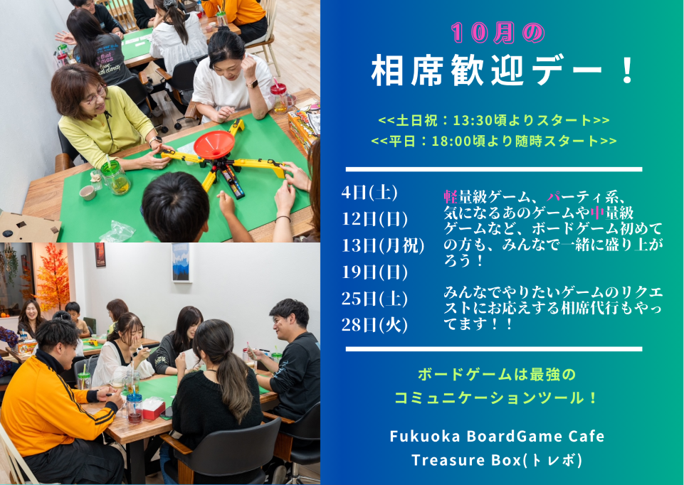 | 詳細内容 | 🔹お一人様や、相席をご希望のお客様 🔸大人数でワイワイパーティ系等で盛り上がりたい方 🔹いつもとは違って4人くらいで程よく楽しみたいお2人組のお客様・・・etc おすすめゲームも多々ございますが、4人・6人とそれぞれで遊べる「数や種類」・「ジャンル」・「盛り上がり方」は当然異なります。当然、人数が増えた方がバリエーションも増えます。 という事で、店内のお客様で、相席で一緒にワイワイ楽しみませんか? ボードゲームが持つ「最強のコミュニケーションツール」という魅力を押し出し、皆さんで一緒に ・トレボでの一期一会を楽しむ! いただき、また楽しいひと時を演出できたらと考えております🎵