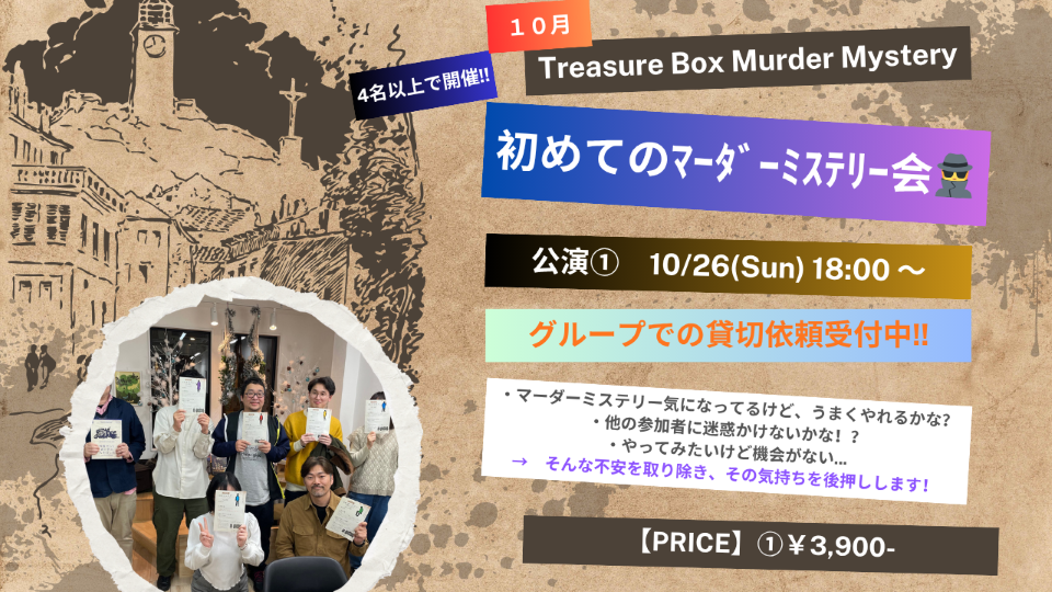 | 詳細内容 | 初めてのマーダーミステリー会🕵️🔰 ・マーダーミステリーに興味を持ち始めた方 ・マーダーミステリーに初めて参加される方 ・何度か体験済だけど、常連さんの中に入って本格的なシナリオをプレイするのは、まだ少し不安… 【本イベントの特徴】