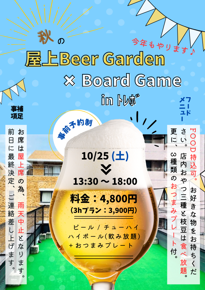 | 詳細内容 | Treasure Box(トレボ)は、「ビル屋上の独占利用権」を持っています🏢 だって、屋上に出られる出入口がトレボ店内にしかないから・・ せっかく「屋上」という場所がありながら、なかなか活用する良い案がなかったので、 ボードゲームカフェで『ビアガーデン企画』を行います🍺 (※天候に左右されるため、中止となる場合がございます。予めご了承ください)