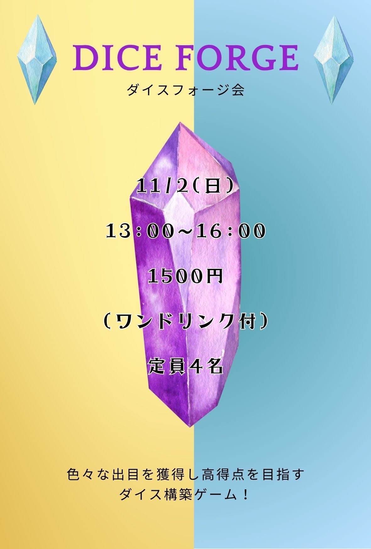 | 詳細内容 | 約1年ぶりに復活開催! ダイスの出目を獲得し得点を稼ぐ構築系ゲーム! 最終目標のために戦略や過程を考える方にオススメ! 日曜昼に皆で最強のダイスを作りませんか?? 🎲日曜ダイスフォージ会 ※ボドゲーマからの予約は受け付けておりません。参加希望者は上記の申し込み方法から必ずお申し込み下さい。