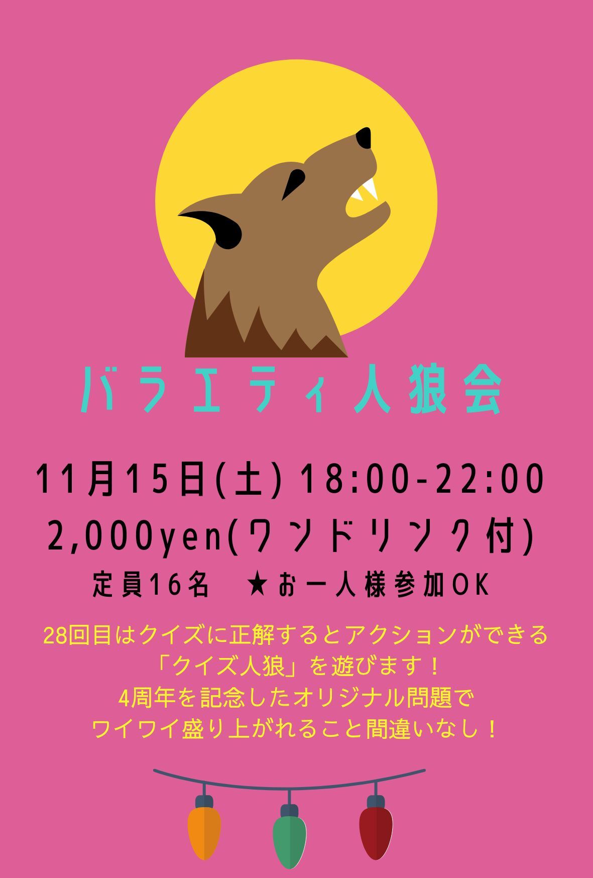 | 詳細内容 | 当店人気イベント「平日人狼会」では遊ばないレギュレーションで遊ぶ人狼イベント! 28回目はクイズに正解しないと行動ができない「クイズ人狼」を単独で初開催! 🐺バラエティ人狼会 ※ボドゲーマからの予約は受け付けておりません。参加希望者は上記の申し込み方法から必ずお申し込み下さい。
