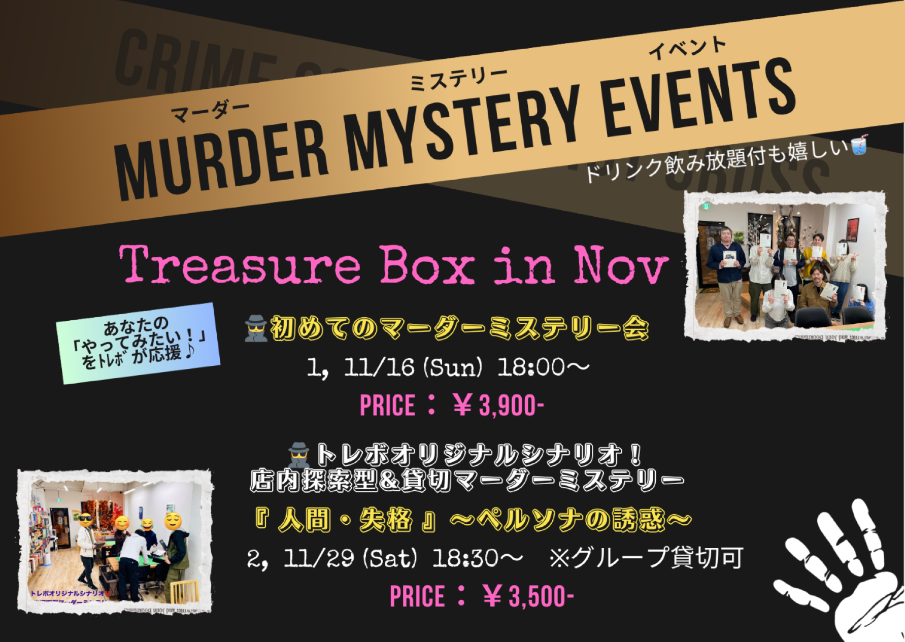 | 詳細内容 | 初めてのマーダーミステリー会🕵️🔰 ・マーダーミステリーに興味を持ち始めた方 ・マーダーミステリーに初めて参加される方 ・何度か体験済だけど、常連さんの中に入って本格的なシナリオをプレイするのは、まだ少し不安… 【本イベントの特徴】
