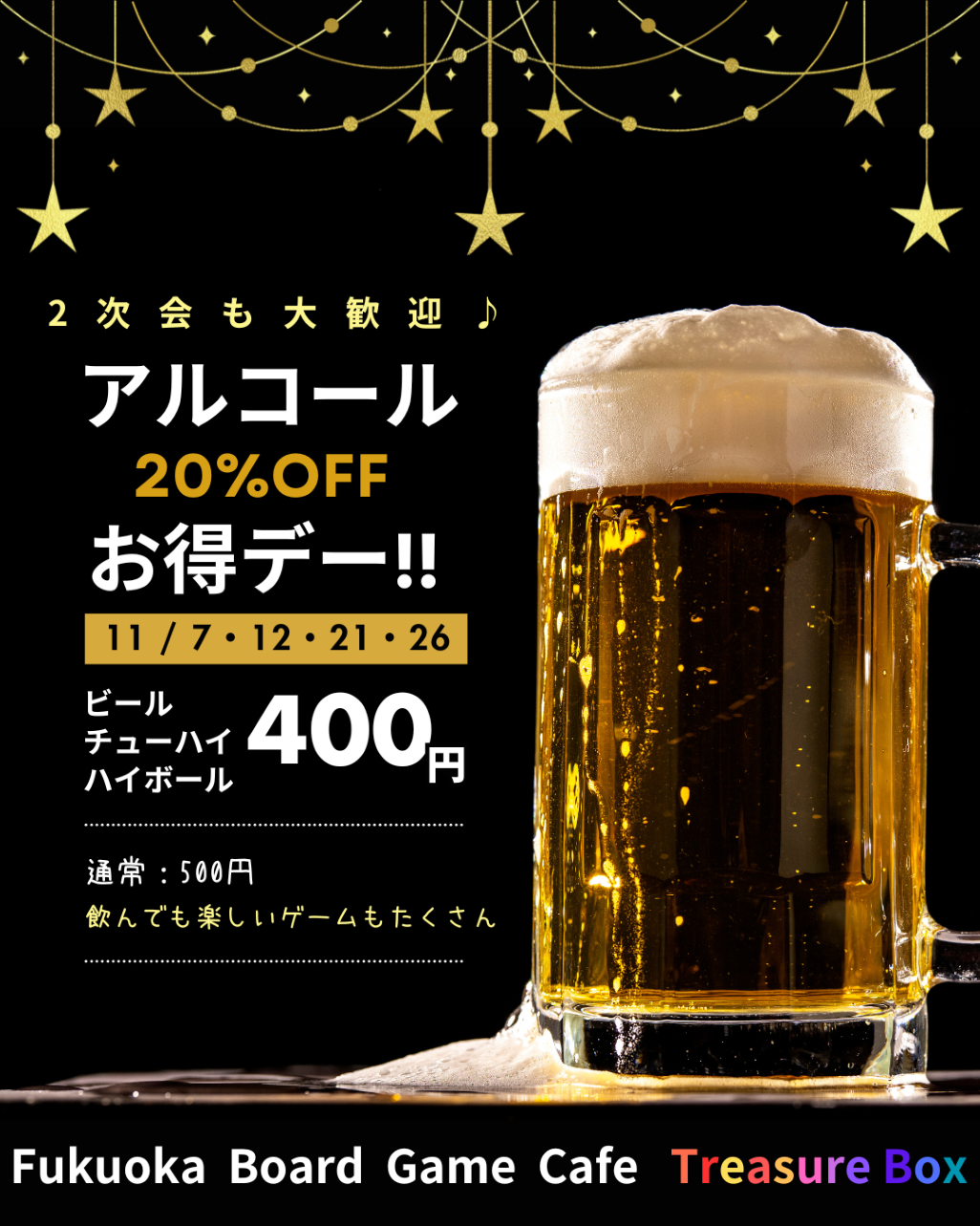 | 詳細内容 | 11月のトレボでは、主に「水曜日」・「金曜日」にアルコール料金がお得になる 【アルコールお得デー♪】を設定します。 ・いつもと違った2次会に ・今週も1週間頑張った自分へのご褒美に ・もっと仲を深めたい仲間とワイワイ 様々なシチュエーションで、ご活用ください!! アルコールが入った方が盛り上がるボードゲームもあるよね♪
