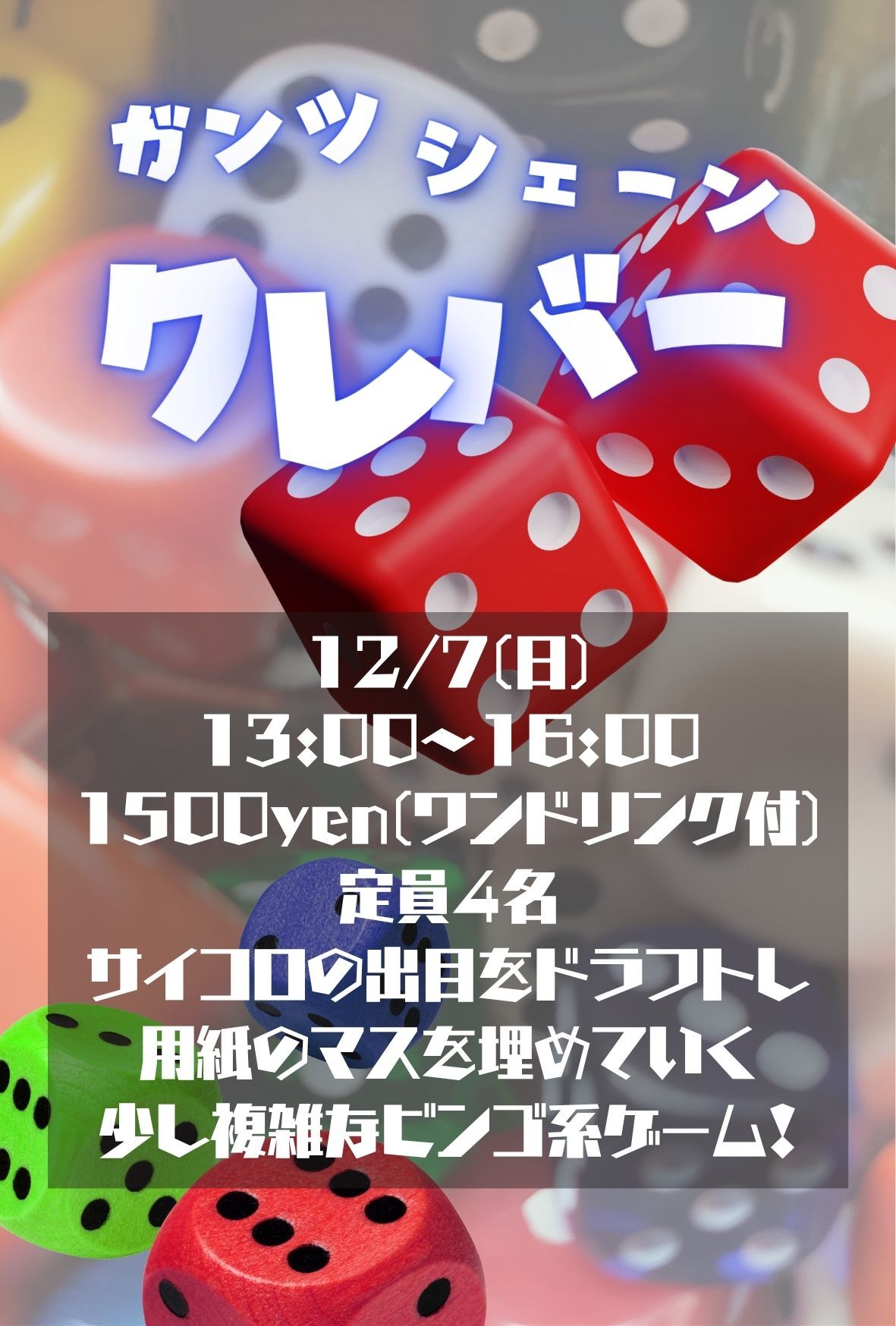 | 詳細内容 | 約1年ぶりに開催! サイコロをとって専用の用紙のマスを埋めていく紙ペンゲーム! このゲームは前半にしっかり基盤を作れると後半はどんどんマスが埋まっていく爽快感を味わえます! 初めての方も大歓迎!ワイワイ楽しめておすすめです! 🖋日曜ガンツ・シェーン・クレバー会 ※ボドゲーマからの予約は受け付けておりません。参加希望者は上記の申し込み方法から必ずお申し込み下さい。