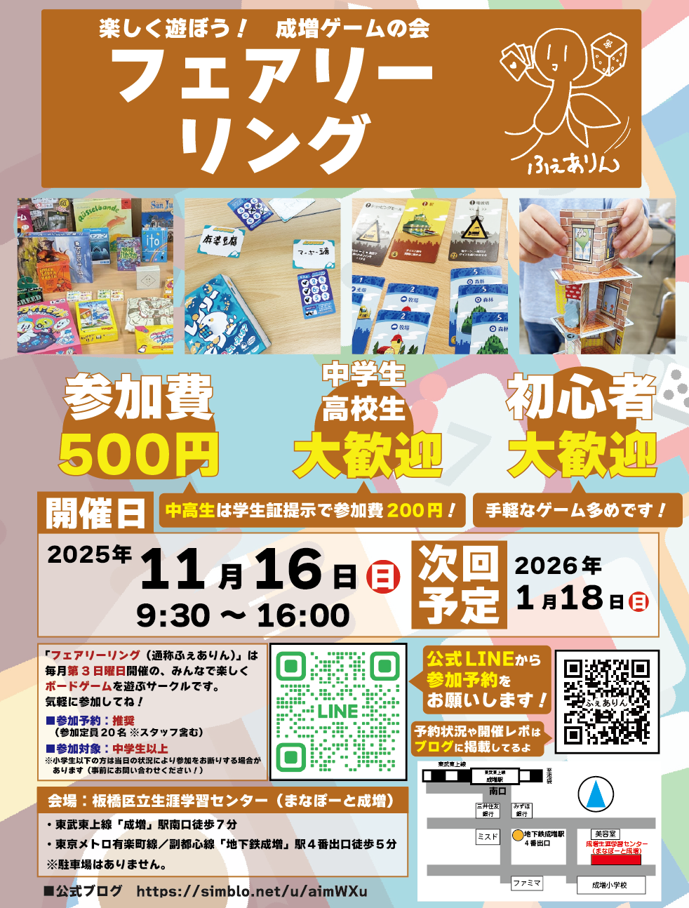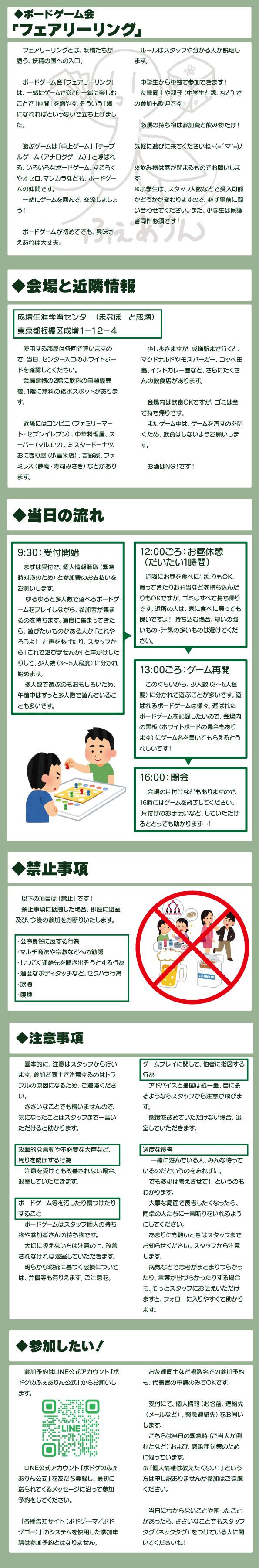 ※当日参加される場合も、事前にLINE公式アカウント「ボドゲのふぇありん公式」 までご連絡ください