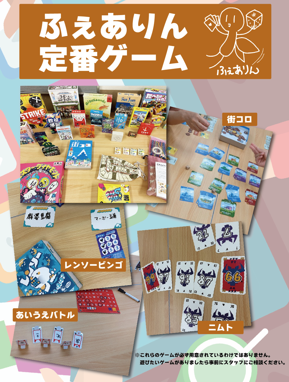 手軽に楽しめるものを中心に、いろいろなボードゲームをご用意してお待ちしています。