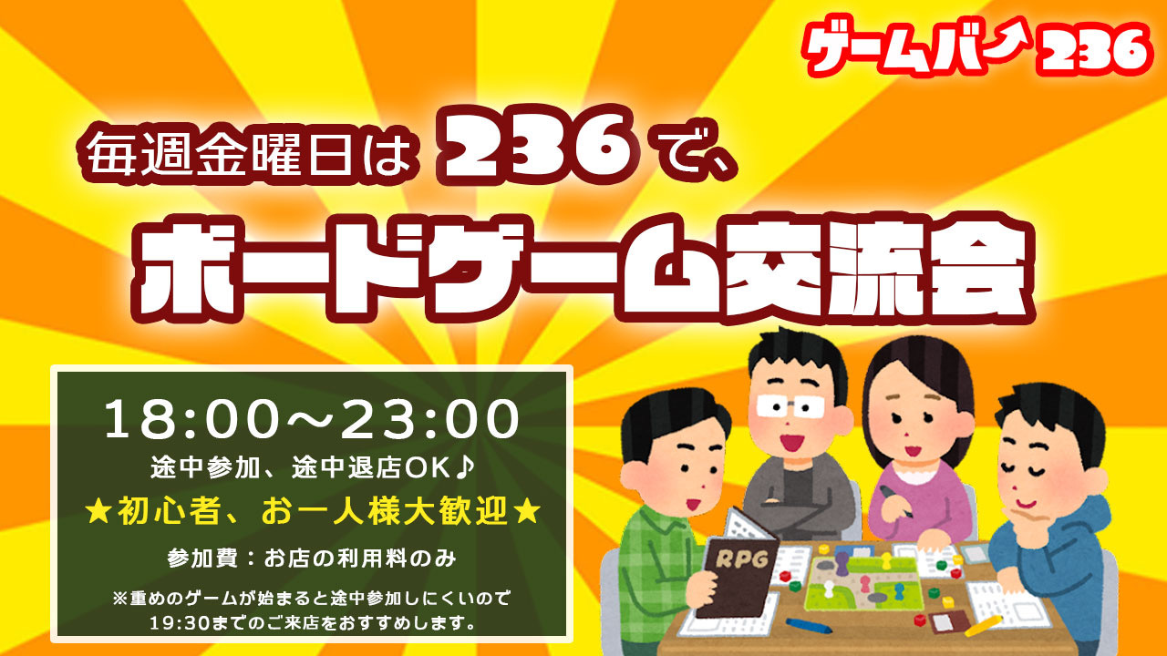 | 詳細内容 | 色々なボードゲームで遊びましょう! 初心者の人からボードゲームが大好きな人までどなたでも大歓迎! おひとり様でご来店頂いても相席で遊んでいただけます。 また、初めて遊ぶボードゲームはスタッフが丁寧に説明しますので安心です。 開催時間は18〜23時で、料金はソフトドリンク飲み放題の最大2,400円となります。 18時から開始ですが、19時半くらいまでは軽めのゲームで遊び、人数が揃ってきたら各々で遊びたいゲームや新作のボードゲームを遊びます。 途中参加、途中離脱も大丈夫ですが、19時30分までにご来店やご連絡を頂いていない場合、遊んでいるボドゲが終わるまで待っていただく場合や、ご参加いただけない場合がございますのでご了承ください。 ご参加お待ちしています! |