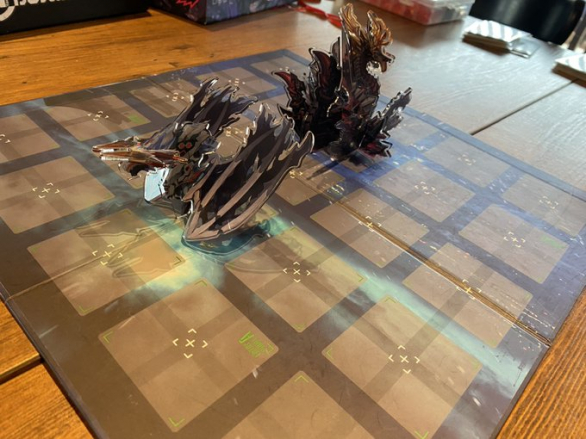 | 詳細内容 | HacKClaDをルール変更して遊ぶ会です。 『2クラッド レギュレーション』 2体のクラッドと戦うレギュレーションです。 通常のルールに下記の変更を加えて遊びます。 ①クラッドの種類と配置 ・ヒュドラ型(Delta) ・ワーム型(無印)orシェル型(CROSS FATE) の2体を下記写真の一と向きで配置します。2体をどちらの一に置くかは自由 ②クラッド同士がぶつかった場合の処理 移動やノックバックでクラッド同士がぶつかる場合、ぶつかられた側のクラッドがノックバックされて押し出されるものとする。ヒュドラ型の帰巣本能でもう1体のクラッドが押し出される場合は、押し出されたクラッドは1マス前進する。 ③レギオンがもう1体のクラッドの位置に生える場合の処理 レギオンは発生しません。 ④クラッドデッキの構築方法 ・Voltage1 2体のクラッドのVoltage1のカード12枚からランダムに6枚選びクラッドデッキとする。 ・Voltage2 2体のクラッドのVoltage1のカード12枚からランダムに6枚と 2体のクラッドのVoltage2のカード6枚からランダムに3枚の合計9枚をクラッドデッキとする。 ・Voltage3 2体のクラッドのVoltage1のカード12枚からランダムに6枚と 2体のクラッドのVoltage2のカード6枚からランダムに3枚と 2体のクラッドのVoltage3のカード6枚からランダムに3枚の合計12枚をクラッドデッキとする。