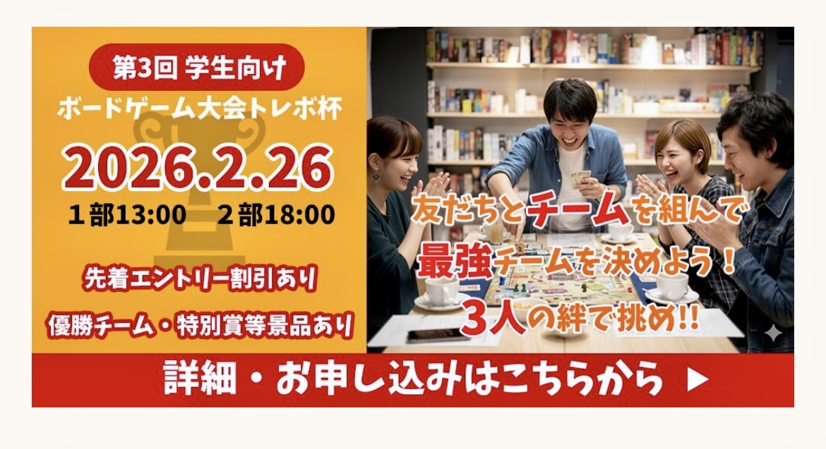 ・『ボードゲームが得意(好き)』 ・『友達や仲間と楽しく遊びたい』 ・『春休みの思い出にみんなで参加してみたい』 ・・・など、理由は何でもOK!! 仲間を3名集めてチームを結成したらエントリー! 複数のボードゲームの勝敗に応じた「得点」で勝敗を競い合う、 大学生チーム対抗ボードゲーム大会『トレボ杯』を開催します!!参加資格は、大学生・大学院生・専門学校生の3名1チームという条件だけ。 【日程】2026年2月27日(木) 【時間】①13:00~ / ②18:00~ 【料金】1チーム3,600円 ※現在、早期お申込み割引適用中です。 たくさんの皆さんのご参加をお待ちしております。 詳細及びお申込みは、下記よりご確認ください👇 |