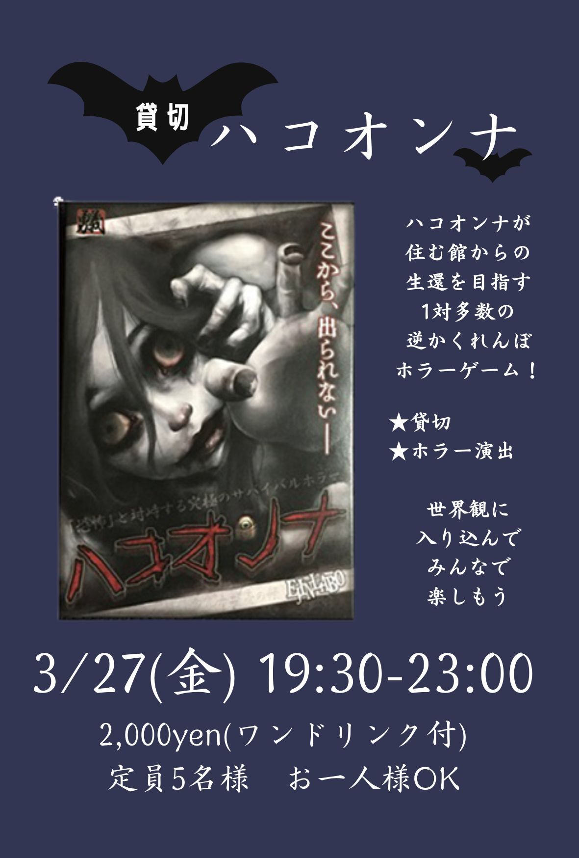 | 詳細内容 | 過去開催し大好評だったイベント「貸切ハコオンナ会」 「ハコオンナ」が潜む館に紛れてしまった探索者が館から生還を目指す1対多数の逆かくれんぼホラーゲーム! 今回イベントの時間帯は店舗を貸切!更にBGMを変えたりやホラー演出もあり! 🧟♀貸切ハコオンナ会 ※ボドゲーマからの予約は受け付けておりません。参加希望者は上記の申し込み方法から必ずお申し込み下さい。