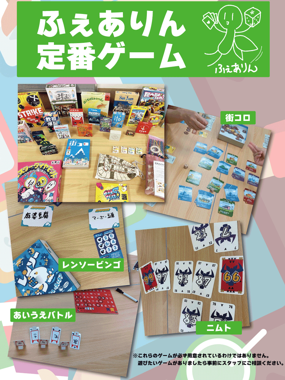 ★「事前の参加予約はしなかったけど、当日に時間が空いたので参加したい!」という場合も、事前にLINE公式アカウント「ボドゲのふぇありん公式」 までご連絡ください。当日の参加状況を見て、参加の可否のご連絡をいたします。ただし、イベント当日はスタッフがイベント運営を行っているため、すぐにお返事できない場合があります。あらかじめご了承ください。