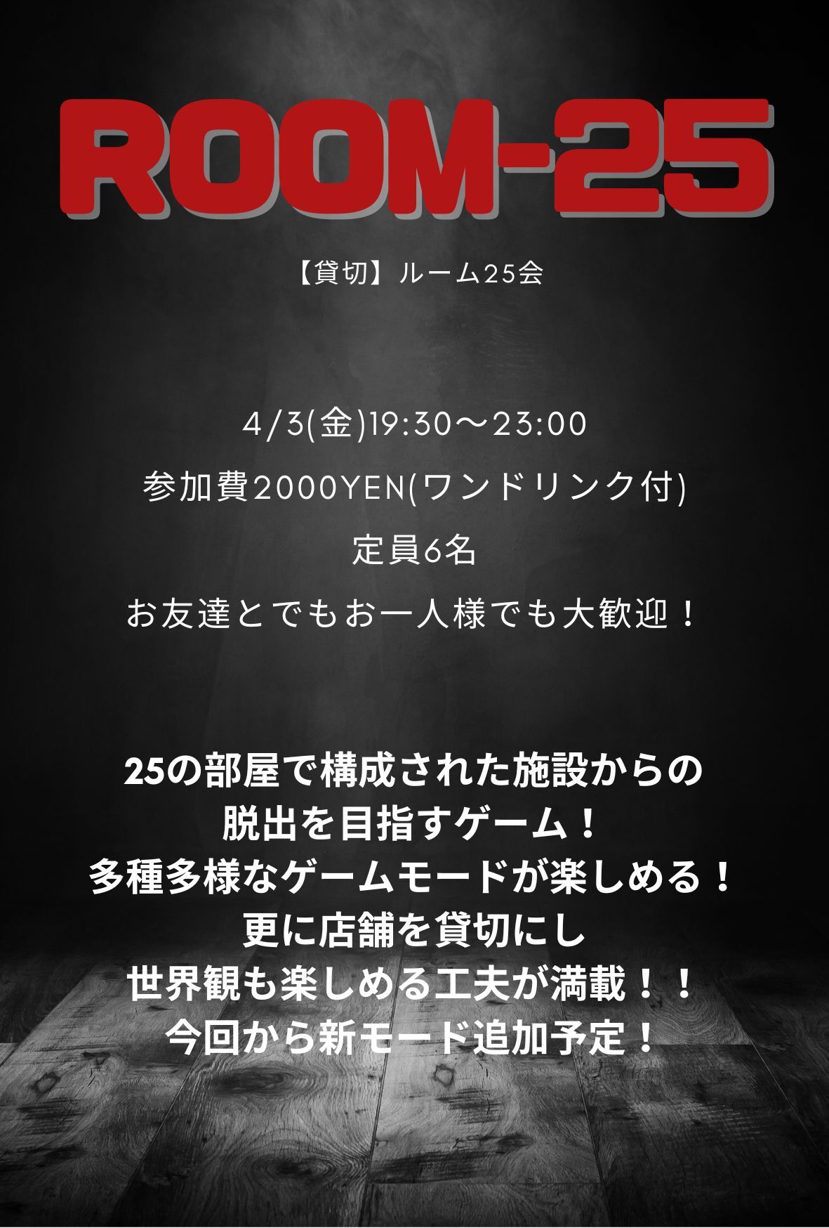 | 詳細内容 | 前回好評につき4カ月ぶりに開催決定!! 25の正方形の部屋からの脱出を目指すゲーム! 今回は店舗を貸切にし、世界観も楽しめる工夫を盛り込む予定です! あなたもぜひこのゲームの一員となって、皆と脱出してみませんか?? 🏢貸切ルーム25会 ※ボドゲーマからの予約は受け付けておりません。参加希望者は上記の申し込み方法から必ずお申し込み下さい。