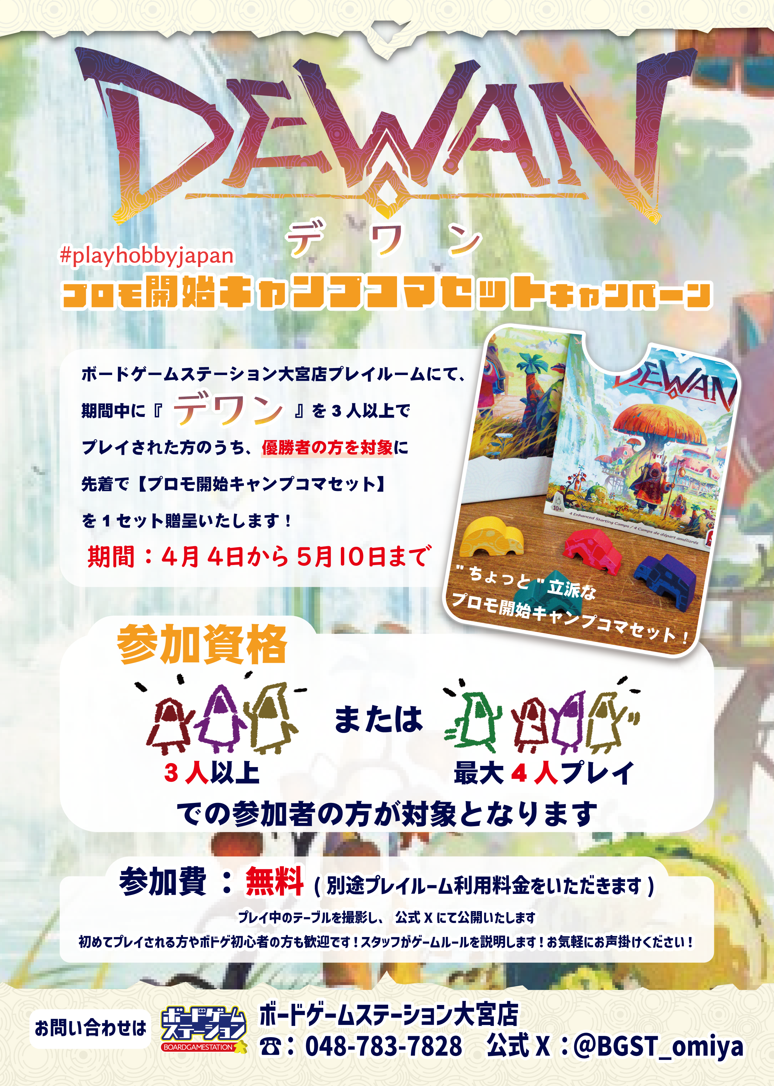 【イベント詳細】本キャンペーンは 2026/4/4(土)~2026/5/10(日)の期間中 ◆開催概要◆ ●開催日:2026年4月4日(土)~2026年5月10日(日) 受付終了時間:平日21:00/土曜20:00/日曜19:00 まで ●参加費:無料※別途プレイルーム利用料金をいただきます ◆参加賞景品◆ ※無くなり次第終了 プロモ名 ・《プロモ開始キャンプコマセット》 【参加方法】 当店プレイルーム*をご利用いただき *プレイルームのご利用は有料です。 「準備が大変そう…」「初めてやるゲームだからルールがわからない…」 🏠ボードゲームステーション大宮店 〒330-0802 埼玉県さいたま市大宮区宮町1-60 大宮ラクーン5階 お問い合わせ☎048-783-7828 HP⇒https://www.bg-st.net/ X(旧Twitter)⇒https://twitter.com/BGST_omiya |