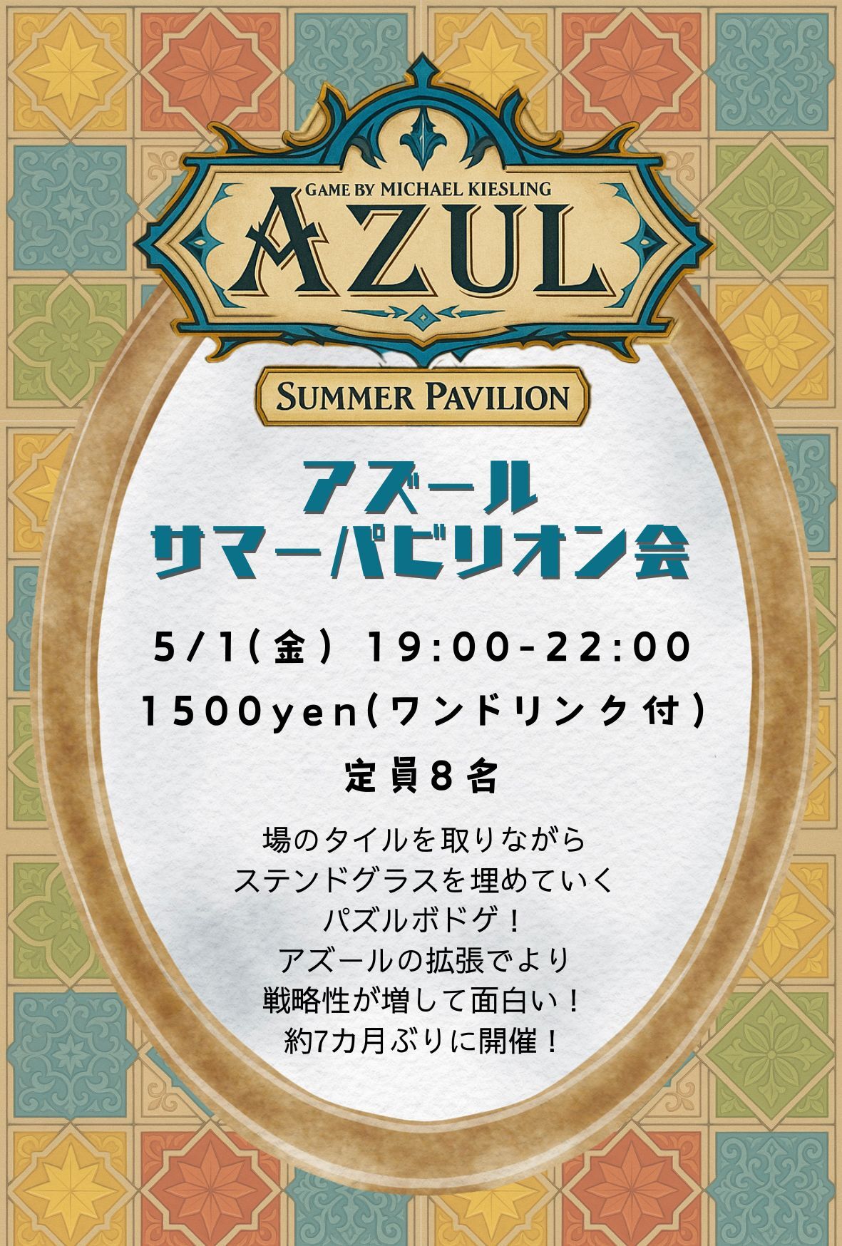 | 詳細内容 | 約7カ月ぶりに復活開催! 平日イベントになったこのボドゲをぜひ遊んでください! 🌴平日アズール:サマーパビリオン会 ※ボドゲーマからの予約は受け付けておりません。参加希望者は上記の申し込み方法から必ずお申し込み下さい。