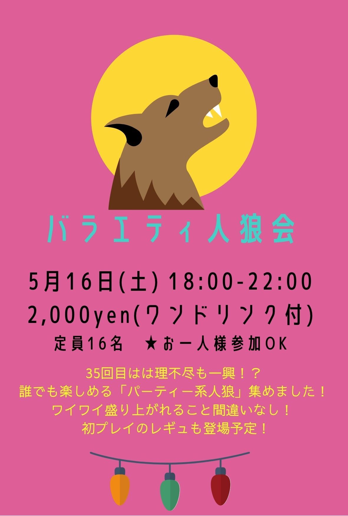 | 詳細内容 | 当店人気イベント「平日人狼会」では遊ばないレギュレーションで遊ぶ人狼イベント! 35回目はワイワイ皆で楽しめる『パーティー系レギュ』をたくさん集めました! 🐺バラエティ人狼会 ※ボドゲーマからの予約は受け付けておりません。参加希望者は上記の申し込み方法から必ずお申し込み下さい。